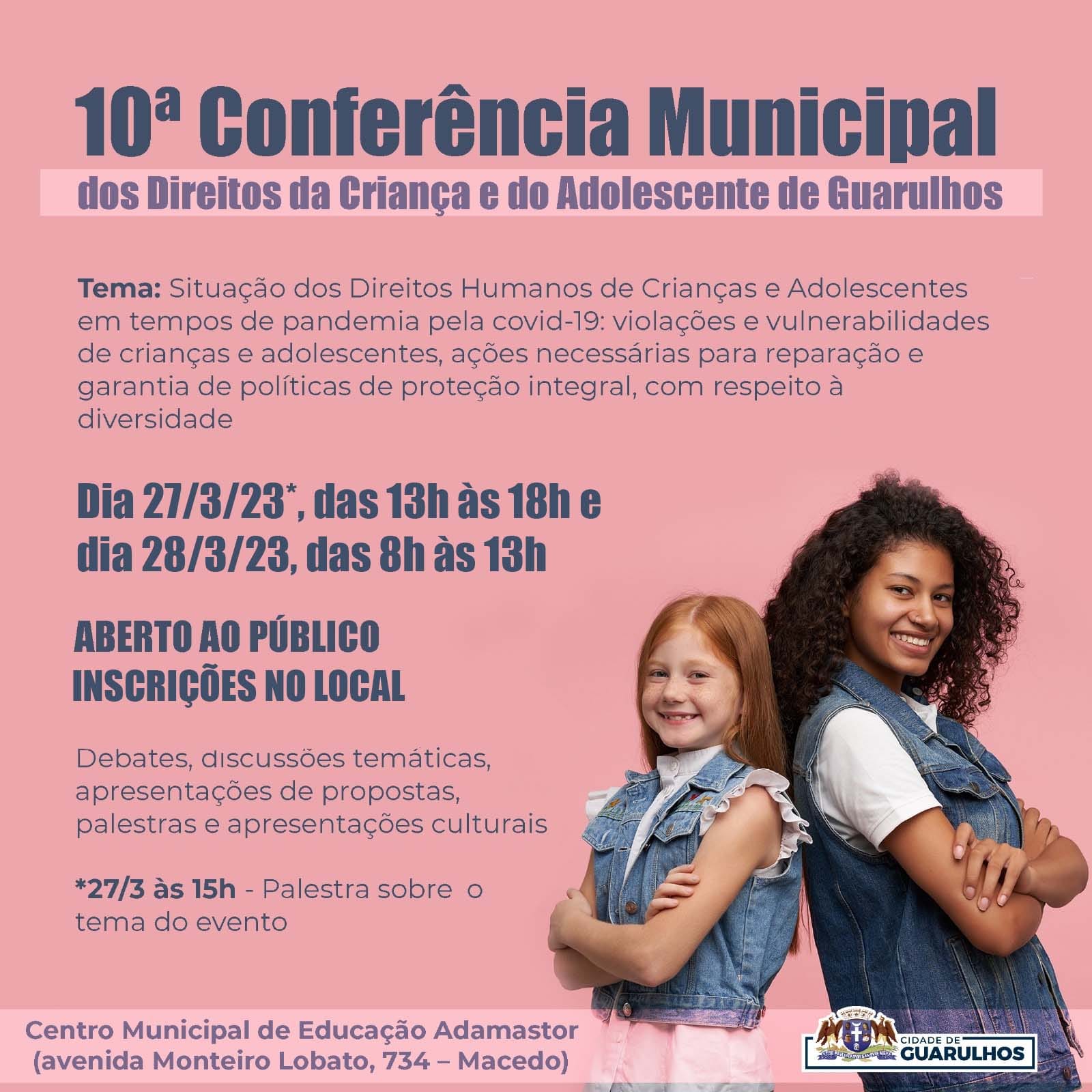 A Prefeitura de Guarulhos promoverá a 10ª Conferência Municipal dos Direitos da Criança e do Adolescente nos próximos dias 27 e 28 de março com uma série de atividades no Adamastor (avenida Monteiro Lobato, 734, Macedo). No dia 27 o evento acontecerá das 13h às 18h, enquanto que no dia 28 será das 8h às 13h.