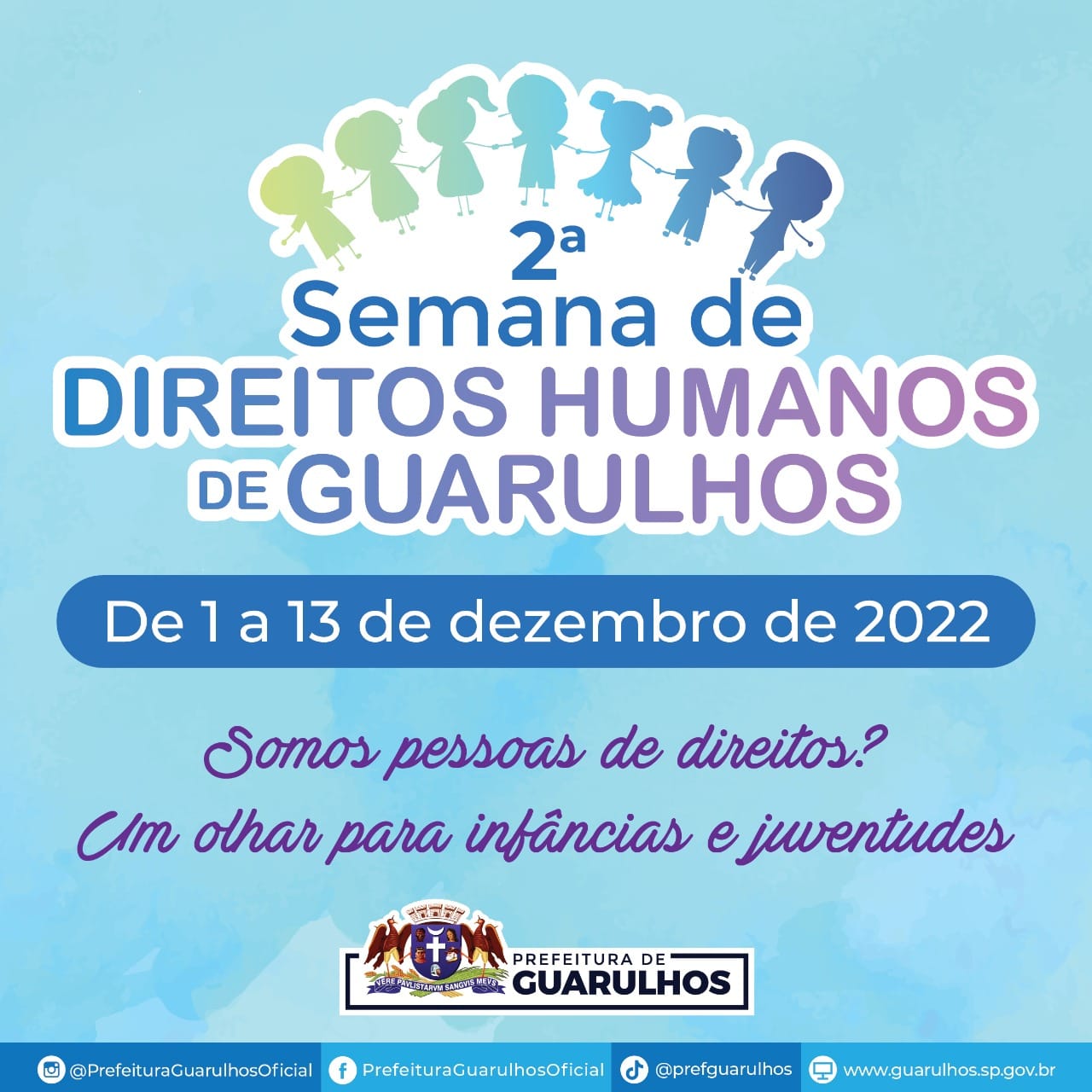 A 2ª Semana de Direitos Humanos, com o tema “Somos Pessoas de Direitos? Um Olhar para Infâncias e Juventudes”, promovida pela Prefeitura de Guarulhos, prevê cerca de cem atividades descentralizadas em várias regiões da cidade a partir desta sexta-feira (2) até o dia 13 de dezembro. Palestras, rodas de conversa, artesanato, exposição de fotos, atividade física, oficinas, entre outras ações, constam da programação, que terá a participação de secretarias municipais e da sociedade civil e que pode ser consultada no link https://portaldireitoshumanos.guarulhos.sp.gov.br/sites/default/files/Programa%C3%A7%C3%A3o%20Completa%202%C2%AA%20Semana%20de%20Direitos%20Humanos%20%284%29.pdf.