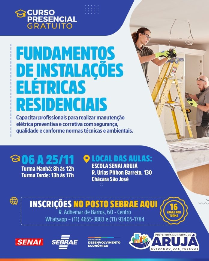 As aulas ocorrerão na Escola SENAI Arujá, localizada na rua Urias Pithon Barreto, 130, Chácara São José, de 06 a 25 de novembro em duas turmas, sendo elas: