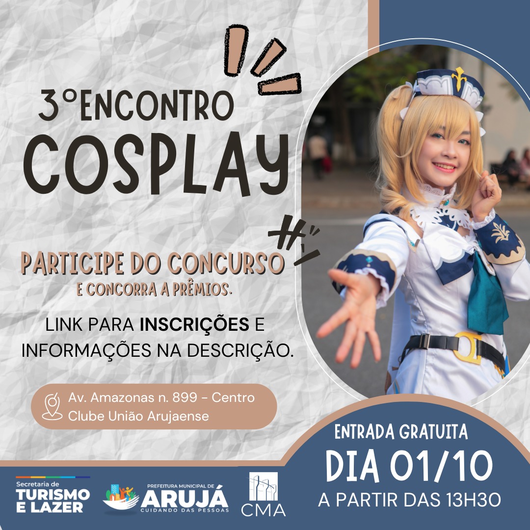 Dia 1° de Outubro teremos o 3° Encontro Cosplay promovido pela Prefeitura de Arujá, pela Secretaria Municipal de Lazer e Turismo.