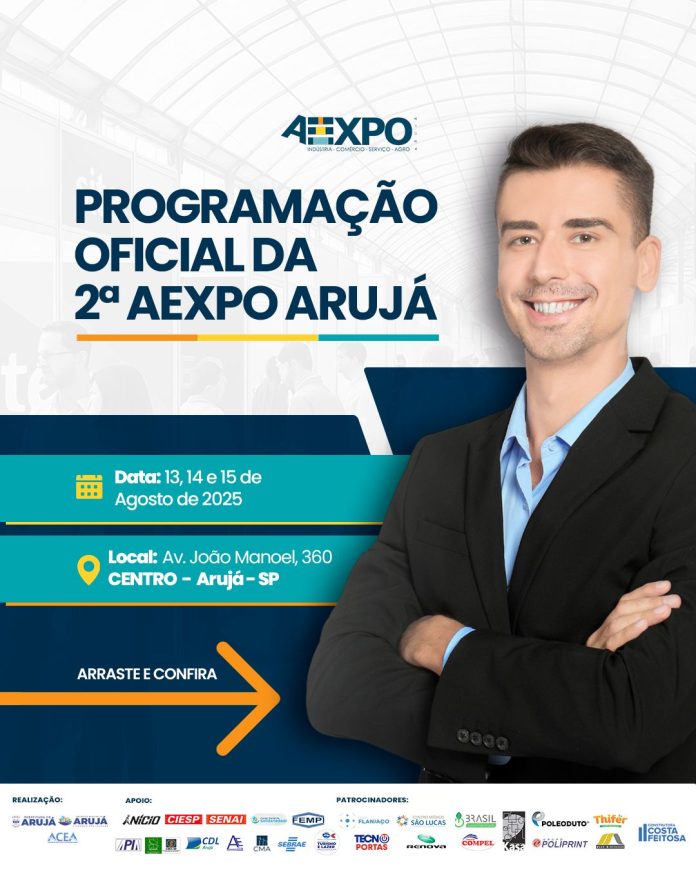 Nesta quarta-feira (13), com início às 14h, Arujá dará início à AEXPO 2025, evento realizado pela Prefeitura de Arujá, por meio da Secretaria Municipal de Desenvolvimento Econômico, e da Associação de Comerciantes e Empreendedores de Aruá (ACEA), que reúne empresários e industriários de diversos segmentos, sendo considerado o maior evento de negócios da região do Alto Tietê. A iniciativa acontecerá perto da Rodoviária de Arujá na Avenida João Manoel, 360, Centro, e é organizada com o apoio da Secretaria Municipal de Turismo e Lazer, do Centro das Indústrias do Estado de São Paulo (Ciesp) Guarulhos, Serviço Nacional de Aprendizagem Industrial (Sebrae), Frente Empresarial Pró-Indústria (FEMPI), Associação das Empresas do Centro Industrial de Arujá (AECIA), Associação do Polo Industrial de Arujá (APIA), Serviço Brasileiro de Apoio às Micro e Pequenas Empresas (Sebrae), Câmara de Dirigentes Lojistas de Arujá (CDL), Câmara Municipal de Arujá, entre outros importantes parceiros e colaboradores.