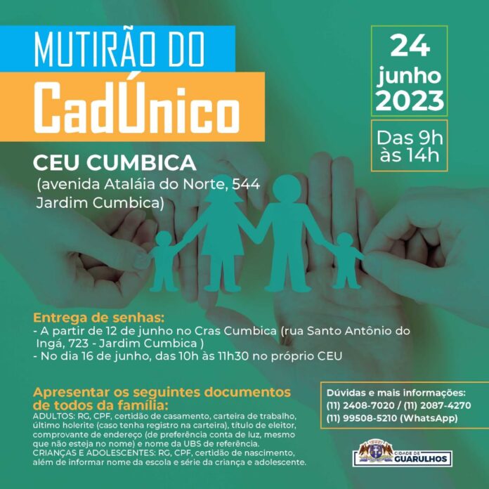 O quinto mutirão do Cadastro Único para Programas Sociais (CadÚnico) de 2023, que ocorrerá no CEU Cumbica no próximo sábado (24), ainda tem senhas disponíveis. Aqueles que desejam ser atendidos no local devem retirá-las no Centro de Referência da Assistência Social (Cras) Cumbica, na rua Santo Antônio do Ingá, 723, em horário comercial.