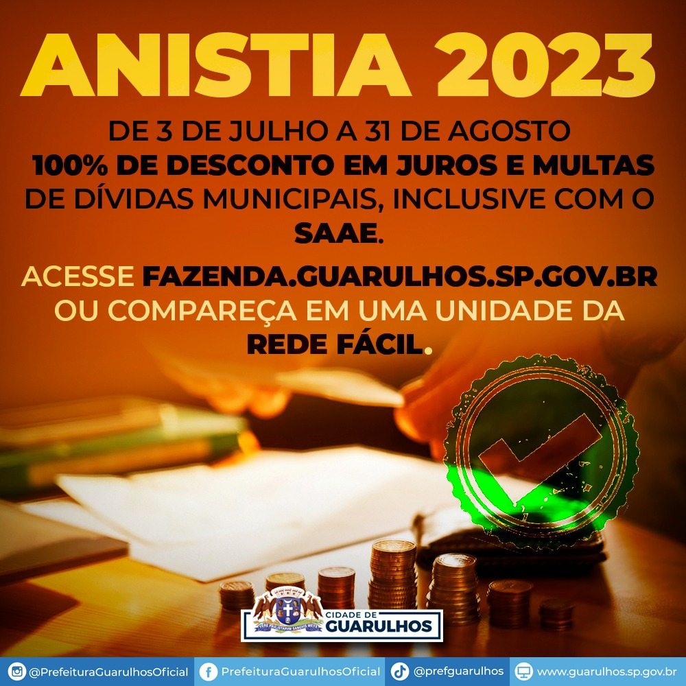 O Programa de Parcelamento Incentivado (PPI) 2023 da Prefeitura de Guarulhos, mais conhecido como anistia, garante até o dia 31 de agosto até 100% de descontos em juros e multas de dívidas municipais de pessoas físicas e jurídicas, inclusive com o extinto Serviço Autônomo de Água e Esgoto (Saae).