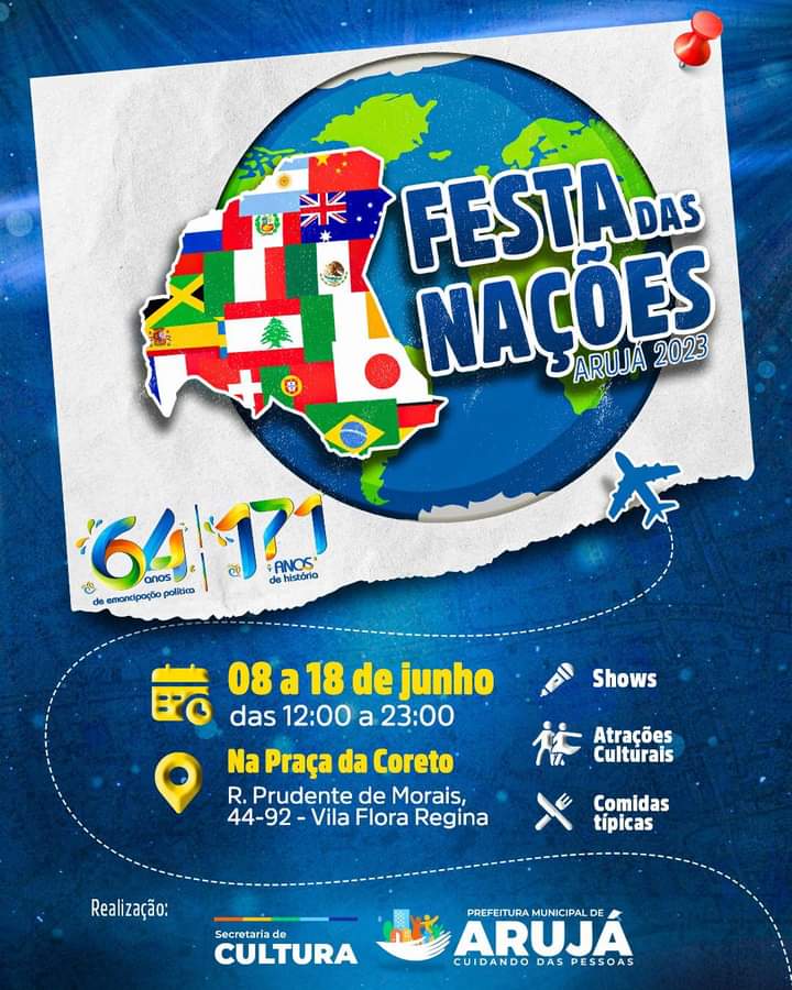 A tradicional Festa das Nações terá vários outros shows, atividades culturais, comidas típicas e muita diversão para toda a família arujaense e os turistas que vierem nos visitar.