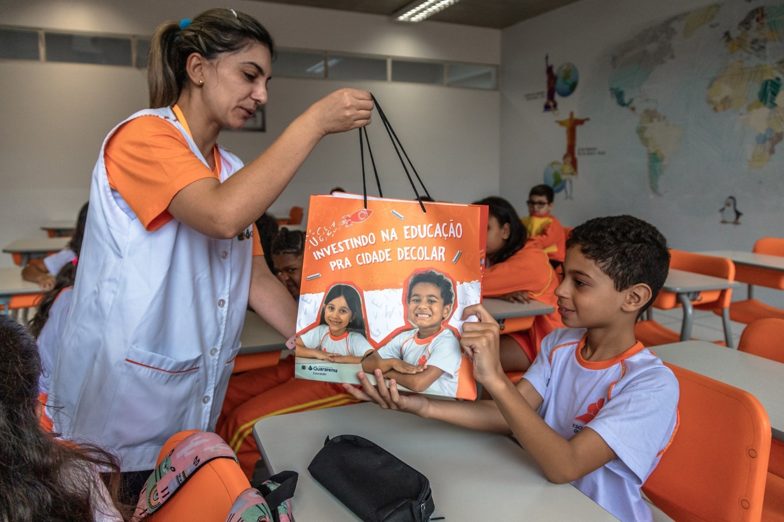 No primeiro dia de aulas, além de conhecer os professores, os colegas e as dependências da escola, os alunos também recebem o material escolar, com os livros, cadernos, lápis e outros itens, além do kit com uma sacola personalizada, uniforme e um folder informativo.