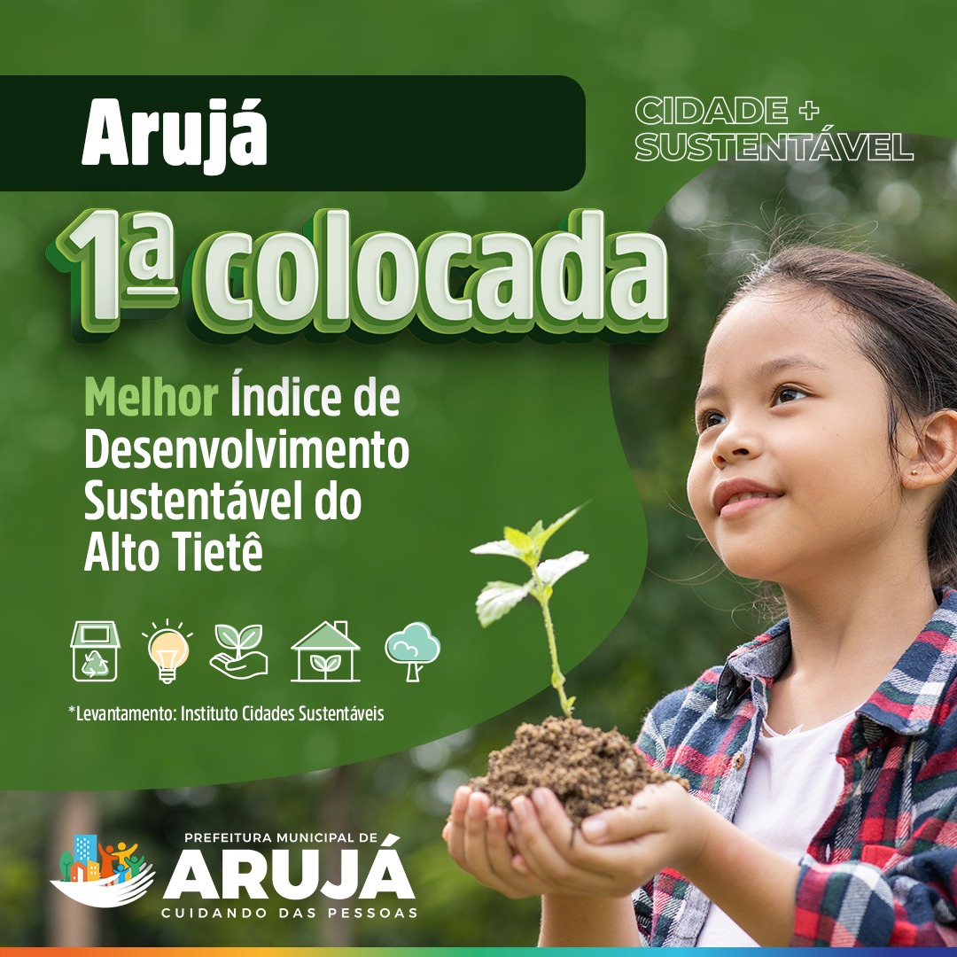 Arujá ocupa a 1ª colocação no Índice de Desenvolvimento Sustentável das Cidades (IDSC) – Brasil na Região do Alto Tietê. O desempenho consta de levantamento do Instituto Cidades Sustentáveis. O IDSC leva em conta o cumprimento dos Objetivos de Desenvolvimento Sustentável (ODS), definidos pela Organização das Nações Unidas (ONU).