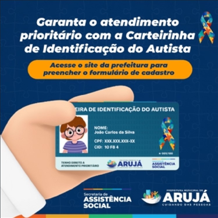 A Prefeitura de Arujá, por meio da Secretaria Municipal de Assistência Social, já emitiu 477 Carteirinhas de Identificação para Pessoas com Transtorno do Espectro Autista (CIPTEA), desde a regulamentação do serviço em 2021. O documento garante atendimento prioritário em estabelecimentos públicos e privados e facilita o acesso à Políticas Públicas e benefícios sociais.