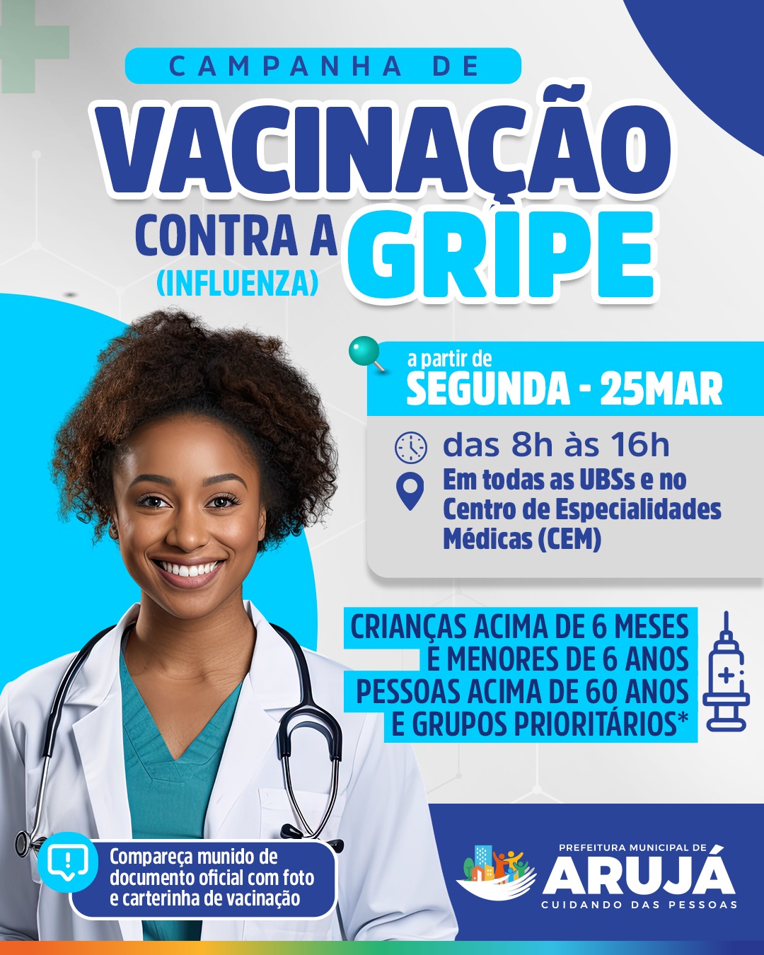 Na próxima segunda-feira (25), a Prefeitura de Arujá, por meio da Secretaria Municipal de Saúde, iniciará a campanha de vacinação contra a gripe (Influenza) em todas as Unidades Básicas de Saúde (UBSs) e no Centro de Especialidades Médicas (CEM) de Arujá, das 08h às 16h.