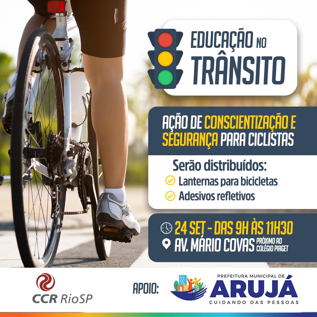 Neste domingo (24), a Prefeitura de Arujá, por meio das Secretarias de Segurança e Esportes, em parceria com a CCR RioSP, promoverá uma ação na Avenida Mário Covas, das 09h às 11h30, com foco na proteção e respeito aos ciclistas. No local serão distribuídos materiais informativos para os motoristas e kits de sinalização de bicicletas para os ciclistas.
