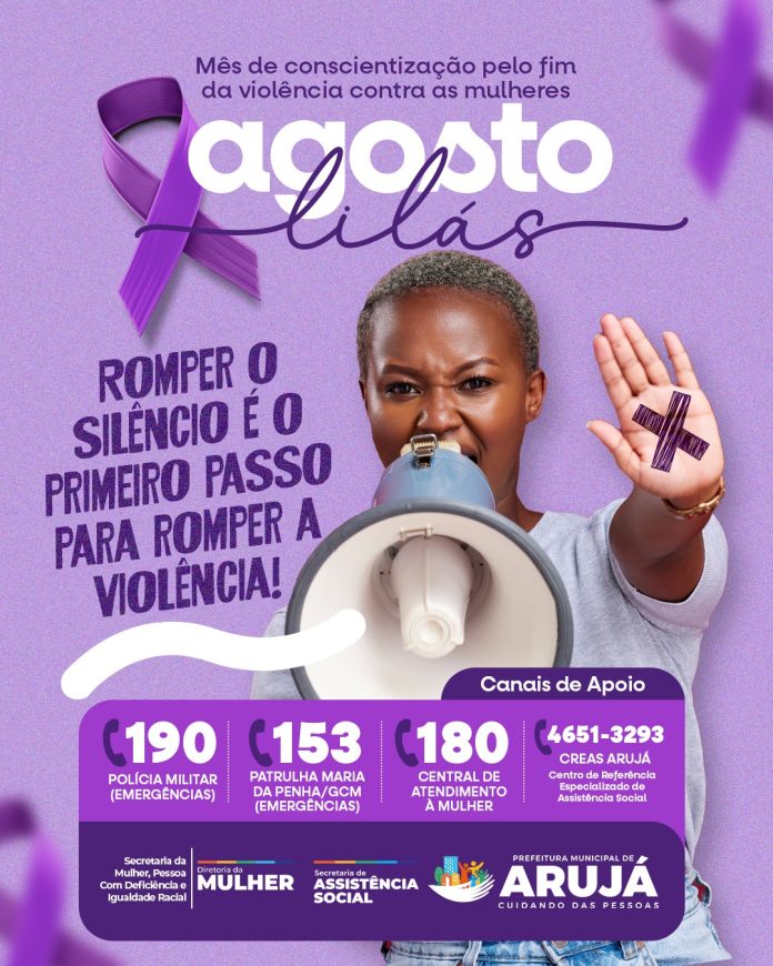 Durante o mês de agosto, a Prefeitura de Arujá reforça a divulgação dos canais de denúncia e acolhimento às mulheres em situação de violência, como parte da campanha nacional Agosto Lilás. A ação tem como objetivo conscientizar a população sobre os diferentes tipos de violência de gênero e fortalecer a rede de proteção e apoio às vítimas.