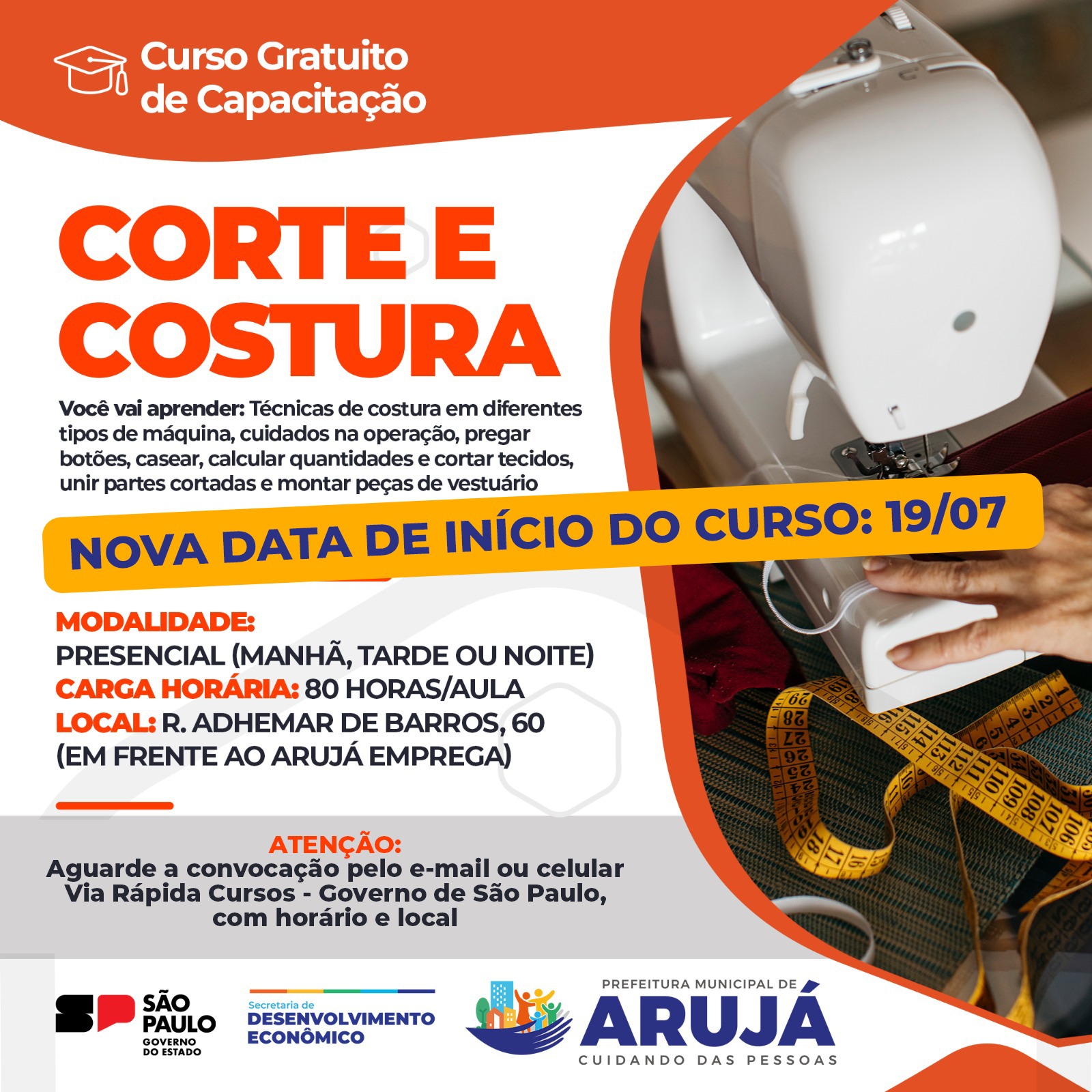 Foi adiado para o próximo dia 19 de julho o início do curso gratuito de qualificação profissional de Corte e Costura. Os inscritos devem aguardar a convocação por e-mail ou celular, a ser enviada pelo Via Rápida Cursos, do Governo de São Paulo, com local e horário para o comparecimento. Haverá um processo de seleção socioeconômica, como consta da inscrição. A formação será oferecida pela Prefeitura de Arujá, por meio da Secretaria Municipal de Desenvolvimento Econômico, em parceria com o Estado. Mais informações pelo WhatsApp 11 4655-4500.