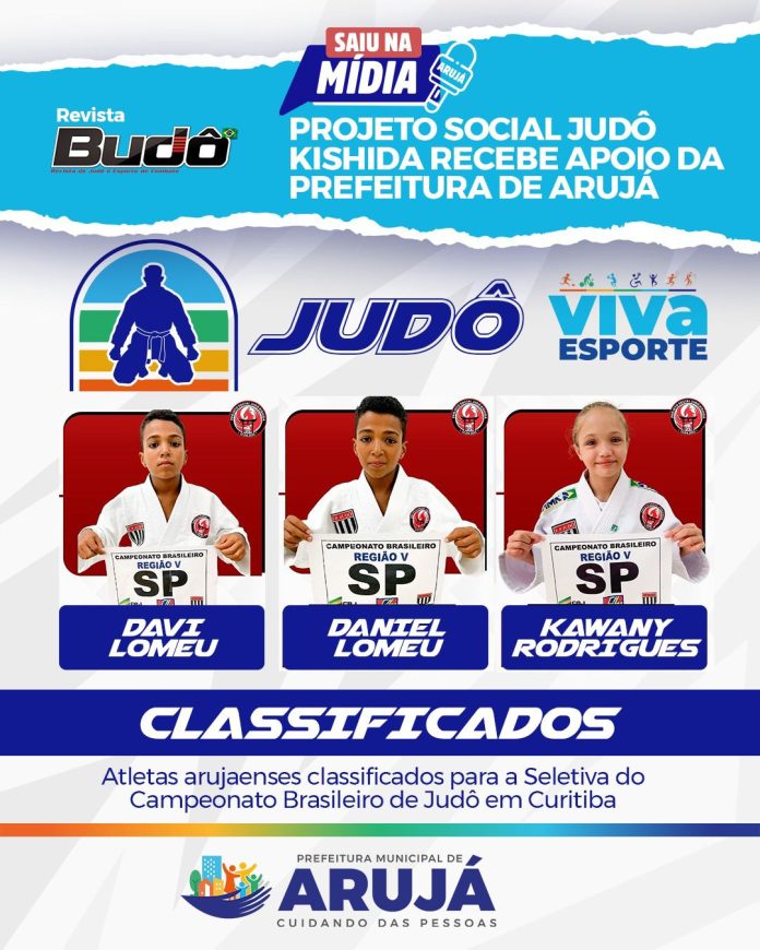 Nos dias 01 a 03 de março, a Federação Paulista de Judô (FPJudô) realizou a Seletiva para o Campeonato Brasileiro Região V de Judô, no Ginásio Poliesportivo Professor José Carlos Miller (Tuta), em Mogi das Cruzes. Três atletas arujaenses, que fazem parte do Projeto Social Judô Kishida/ Viva Esporte, apoiado pela Prefeitura de Arujá, foram classificados. São eles: Kawany Rodrigues, vice-campeã, que competirá na categoria sub 13 – meio leve; Davi Lomeu, vice-campeão, que disputará na categoria sub 13 – super ligeiro; e Daniel Lomeu, campeão, que entrará em competição na categoria sub 13 – super ligeiro. A próxima etapa do Campeonato Brasileiro de Judô Regional acontecerá nos dias 05, 06 e 07 de abril, no Ginásio Tarumã, em Curitiba.