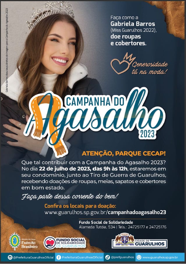 O Parque Cecap receberá no próximo sábado (22) uma ação do Fundo Social de Solidariedade de Guarulhos para a arrecadação de roupas, sapatos e cobertores em bom estado para a Campanha do Agasalho 2023.