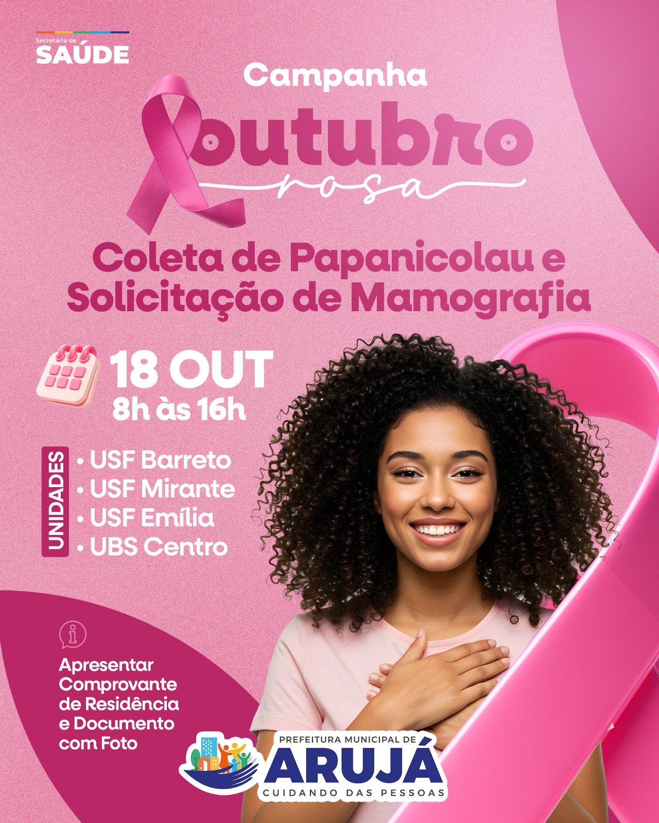 Neste sábado (18), a Prefeitura de Arujá, por meio da Secretaria Municipal de Saúde, realizará a Campanha do Outubro Rosa, que acontecerá na USF Barreto (Rua Pedro Severino Martins, 231, Barreto), na USF Mirante (Estrada do Kondo, 712, Mirante), na USF Emília (Rua Oscar Schiavon, 390, Jardim Emília) e na UBS Centro (Avenida dos Expedicionários, 1255, Centro), das 8h às 16h.