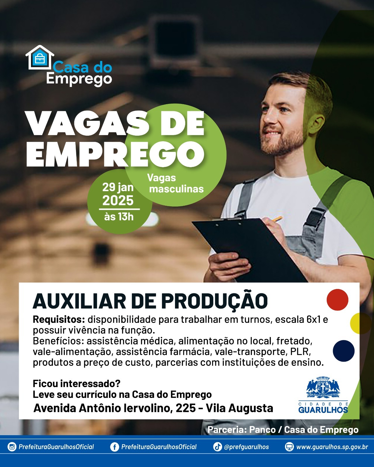 Na próxima quarta-feira (29), às 13h, a Casa do Emprego da Vila Augusta (antiga Ameg) realizará seleção para 60 vagas de auxiliar de produção abertas pela empresa Panco. Para participar do processo seletivo é necessário ser do sexo masculino, possuir vivência na função, ter disponibilidade para trabalhar na escala 6×1 e levar currículo impresso.