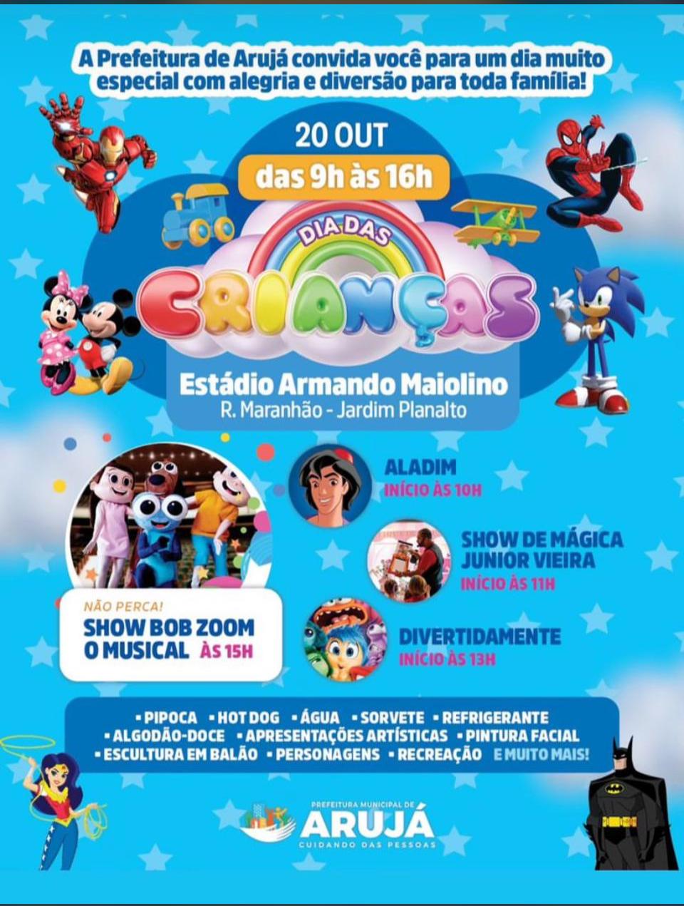 A Prefeitura de Arujá, em parceria com o Fundo Social de Solidariedade e as Secretarias Municipais, preparou uma programação especial para celebrar o Dia das Crianças no dia 20 de outubro, das 9h às 16h, no Estádio Armando Maiolino, localizado na Rua Maranhão, Jardim Planalto. No evento, os pequenos poderão se divertir com pintura facial, escultura em balão, personagens e brinquedos, além de desfrutar das barracas de comes e bebes, que oferecerão pipoca, hot dog, algodão doce, sorvete e refrigerante.