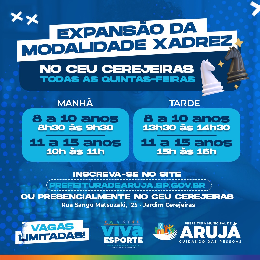 A Prefeitura de Arujá, por meio do Programa Municipal “Viva Esporte”, da Secretaria Municipal de Esportes, disponibilizará, às quintas-feiras, aulas de xadrez no período da manhã e da tarde. As vagas são limitadas e podem se inscrever pessoas de 8 a 15 anos de idade.