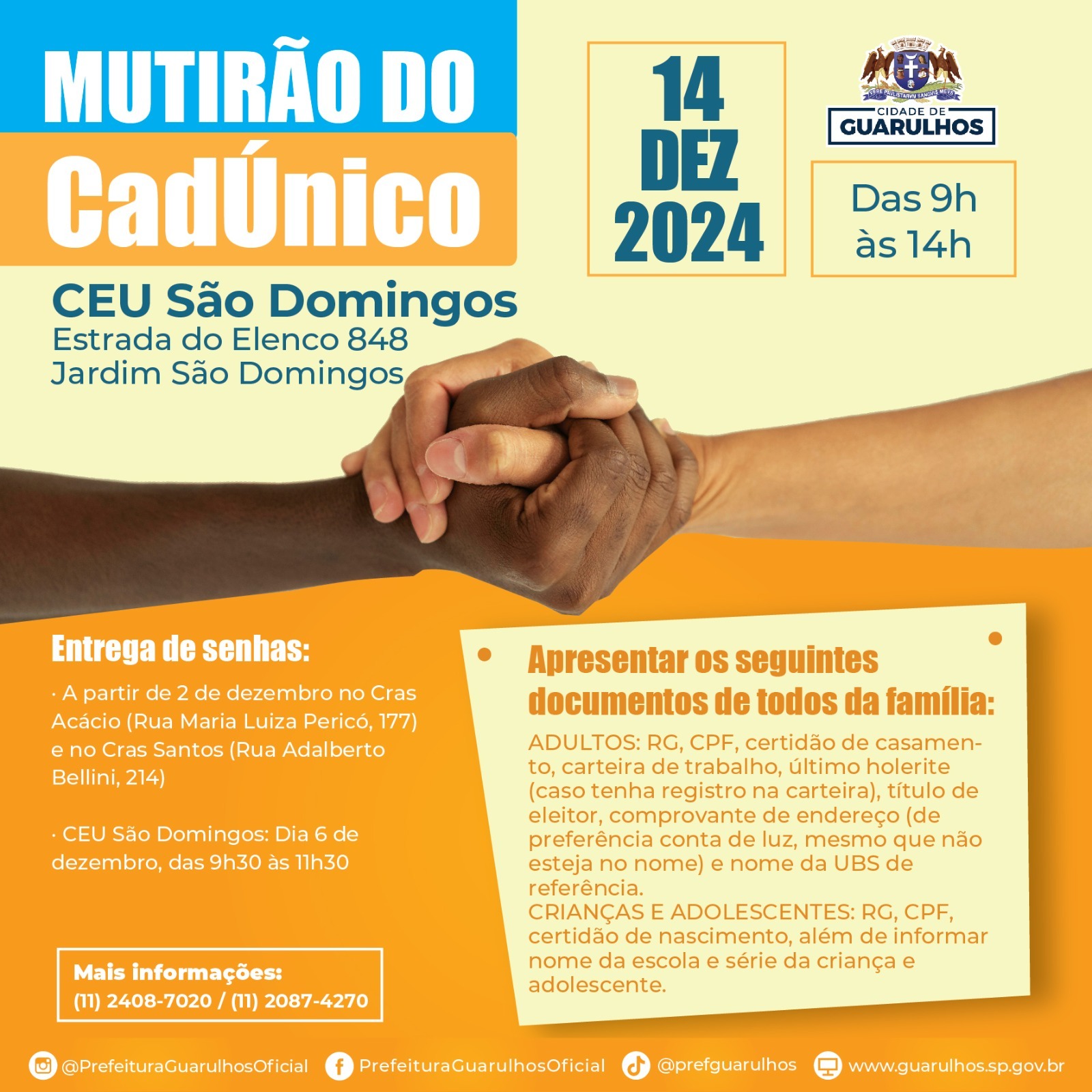 O último mutirão do CadÚnico do ano acontecerá no CEU São Domingos no dia 14 de dezembro, das 9h às 14h. No evento a população poderá realizar novos cadastros e a atualização das informações do Cadastro Único para Programas Sociais, banco de dados do governo federal que conecta a população em situação de vulnerabilidade a diversos benefícios municipais, estaduais e federais.