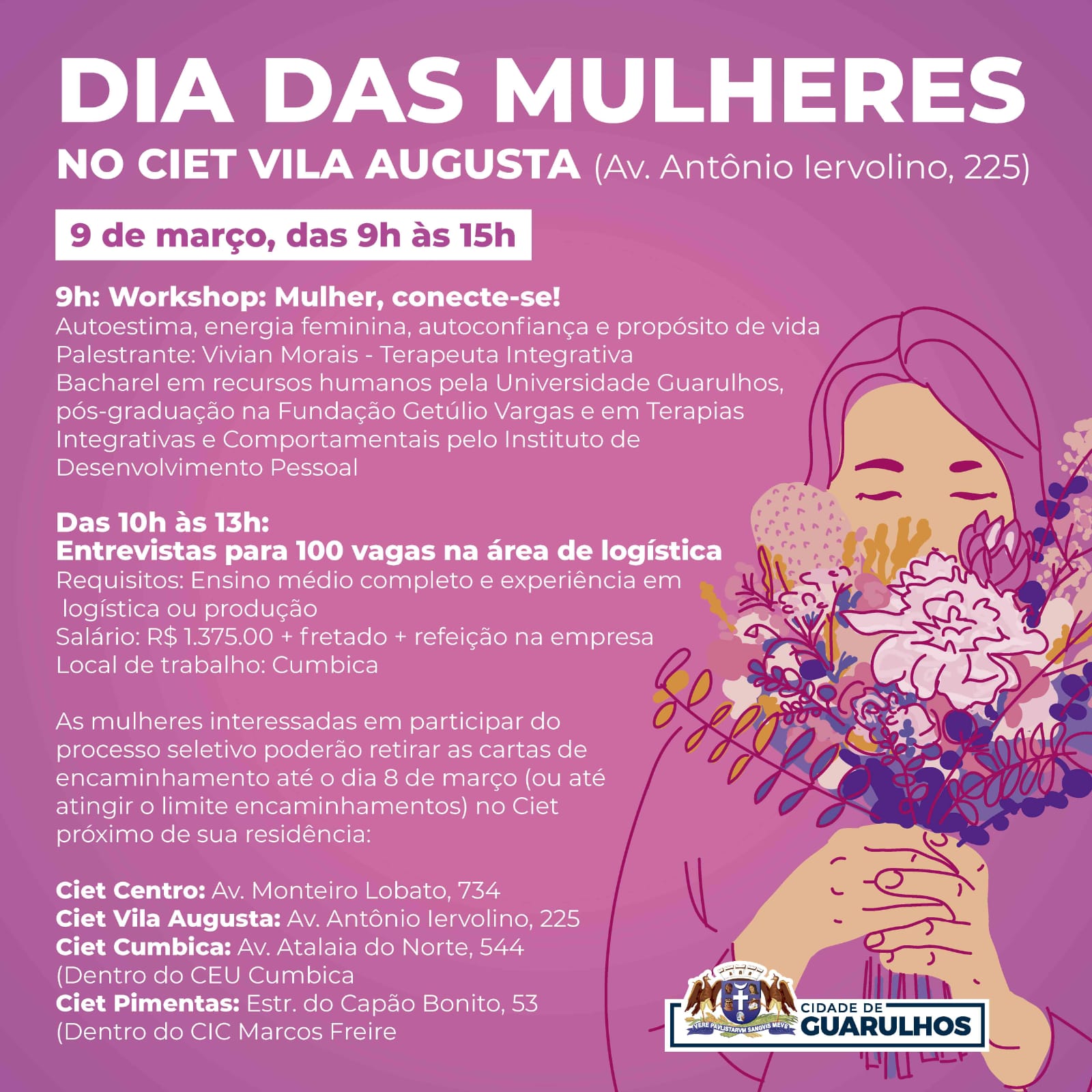 Já das 10h às 13h acontecerão entrevistas para cem vagas de emprego na área de logística. As mulheres interessadas em participar das palestras e do processo seletivo poderão retirar as cartas de encaminhamento até quarta-feira (8) ou até atingir o limite de encaminhamentos no Ciet mais próximo de sua residência.