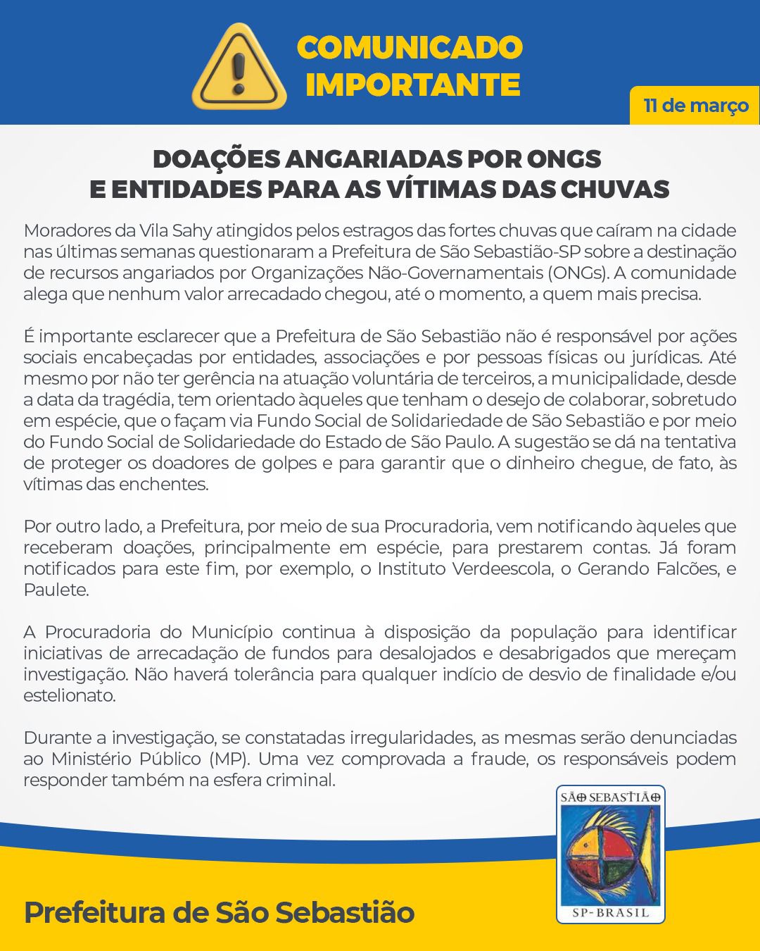 É importante esclarecer que a Prefeitura de São Sebastião não é responsável por ações sociais encabeçadas por entidades, associações e por pessoas físicas ou jurídicas. Até mesmo por não ter gerência na atuação voluntária de terceiros, a municipalidade, desde a data da tragédia, tem orientado àqueles que tenham o desejo de colaborar, sobretudo em espécie, que o façam via Fundo Social de Solidariedade de São Sebastião e por meio do Fundo Social de Solidariedade do Estado de São Paulo. A sugestão se dá na tentativa de proteger os doadores de golpes e para garantir que o dinheiro chegue, de fato, às vítimas das enchentes.