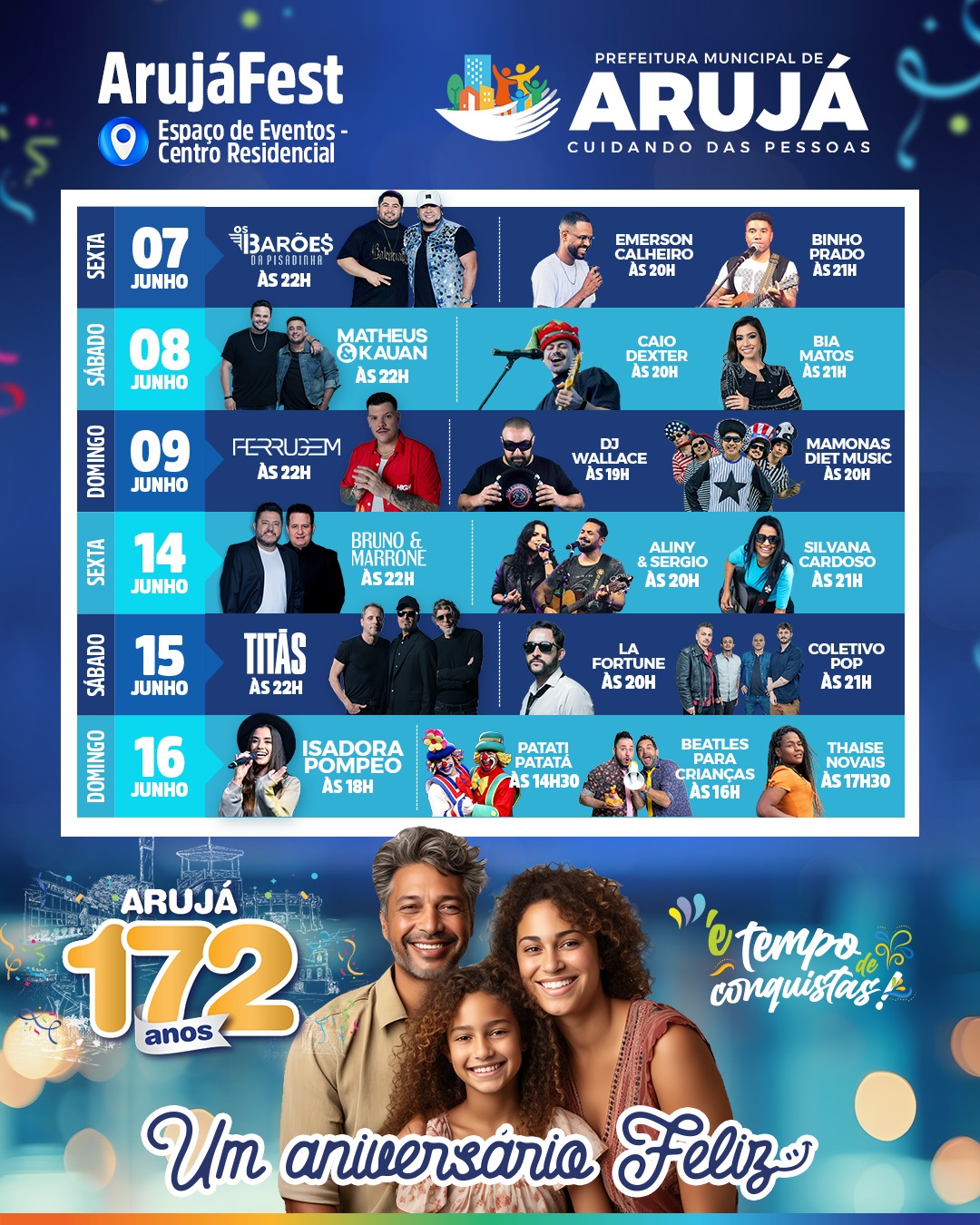 No próximo final de semana, a Prefeitura de Arujá, por meio da Secretaria Municipal de Turismo e Lazer, dará início à celebração do aniversário de 172 anos da cidade, no Espaço de Eventos, localizado no Centro Residencial (próximo à Sorveteria Natureza). De 7 a 16 de junho, a programação contará com shows de grandes artistas nacionais, além de talentos locais, destacando-se nos estilos musicais sertanejo, forró, pagode, rock, infantil e gospel.