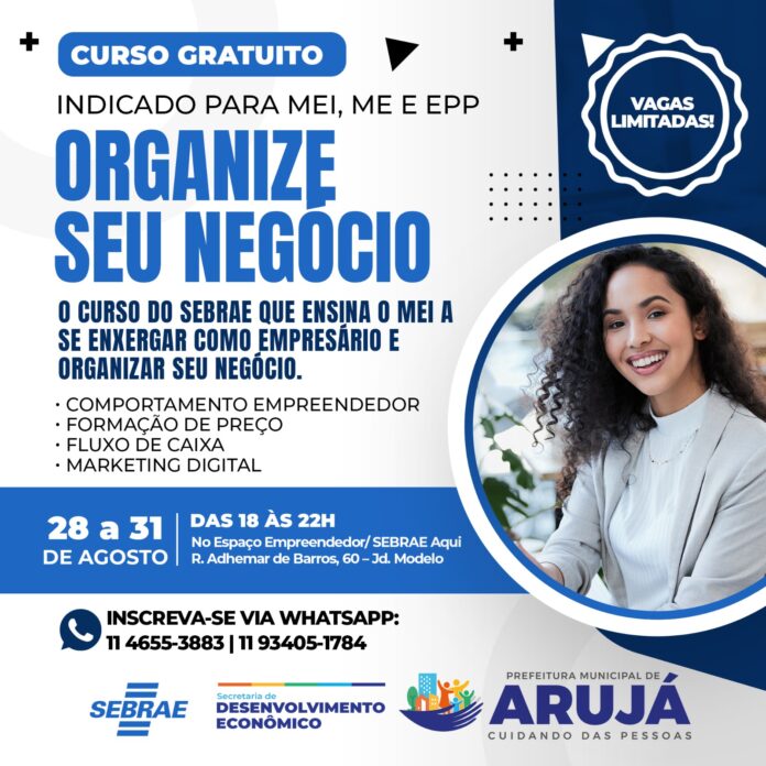 Sob medida para Microempreendedor Individual (MEI), Microempresa (ME) e Empresa de Pequeno Porte (EPP), o curso gratuito do Sebrae ensina o pequeno empresário a organizar o seu negócio. A formação será realizada de 28 a 31 de agosto, das 18 às 22 horas, no Espaço Empreendedor. É uma iniciativa da Prefeitura de Arujá, pela Secretaria Municipal de Desenvolvimento Econômico, em parceria com o Sebrae. É o preparo de que você precisa para o crescimento da sua empresa. Vagas limitadas. Informações e inscrições pelo WhatsApp: 11 4655-3883 e 11 93405-1784.