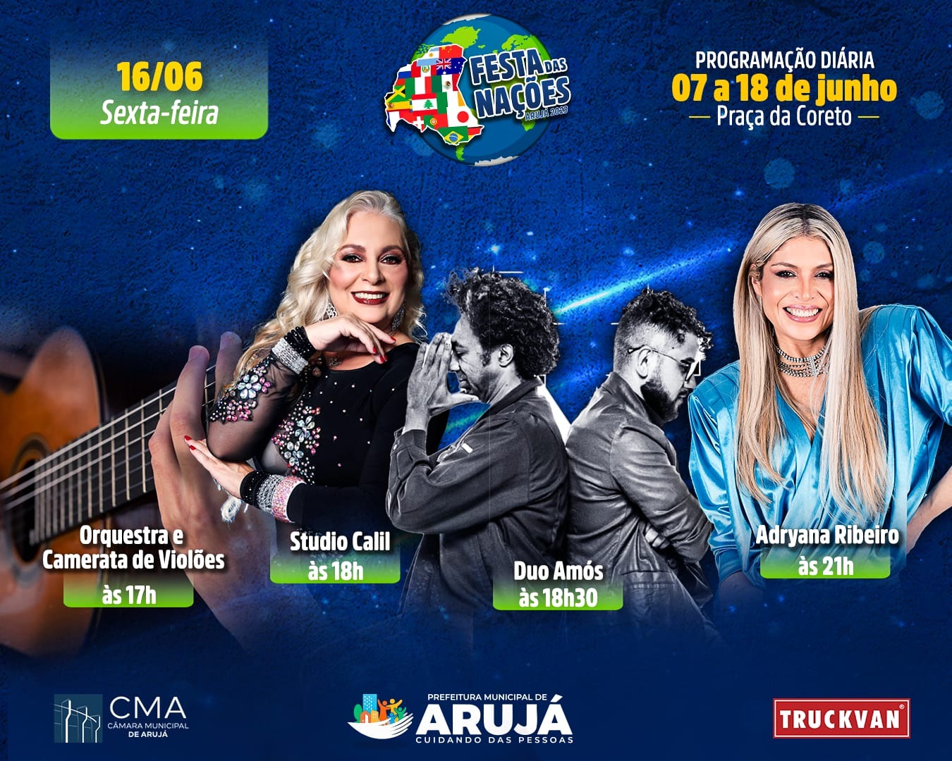 A música clássica invade hoje (16) a Festa das Nações, levada pela Orquestra e Camerata de Violões, que entra em cena às 17 horas. Às 18 horas, tem dança do ventre com o Studio Calil. Em seguida, às 18h30, vem Duo Amós. Fechando as atrações da noite, às 21 horas, tem o supershow de Adryana Ribeiro. Tudo na Praça do Coreto, Centro de Arujá, com acesso gratuito. Curta as festividades do Aniversário da Cidade!
