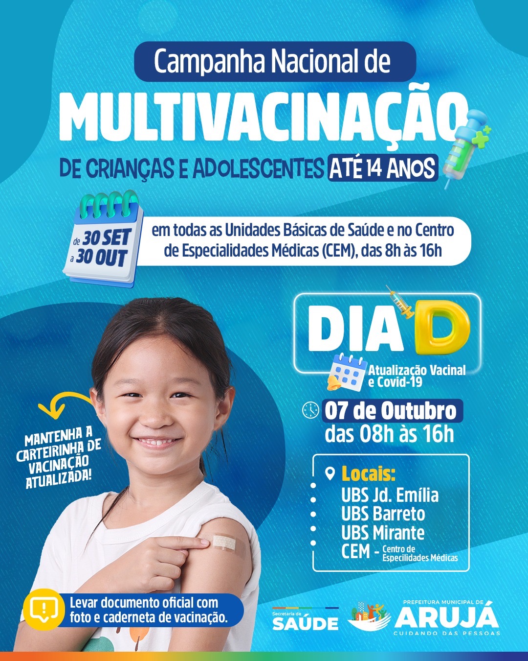 Neste sábado (07), a Prefeitura de Arujá realiza o “Dia D” da Campanha de Multivacinação para crianças e adolescentes de até 14 anos. Nesta data, as equipes da Secretaria Municipal de Saúde estarão nas Unidades Básicas de Saúde (UBSs) Parque Rodrigo Barreto (rua Pedro Severino Martins, 231), Mirante (estrada do Kondo, 712), Jardim Emilia (rua Oscar Schiavon, 391) e no Centro de Especialidades Médicas (CEM na avenida dos Expedicionários, 1255), das 08h às 16h. Durante o período, serão aplicadas as vacinas do calendário nacional de imunização, para atualização da caderneta. Imunizantes contra a Covid-19 também estarão disponíveis.