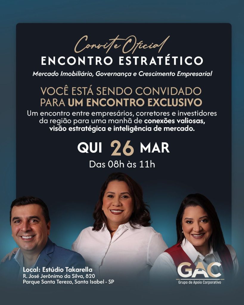 Santa Isabel será palco de um evento que promete movimentar o cenário empresarial e imobiliário da região. No próximo dia 26 de março, das 08h às 11h, acontece o Encontro Estratégico: Mercado Imobiliário, Governança e Crescimento Empresarial, no Estúdio Takarella.
