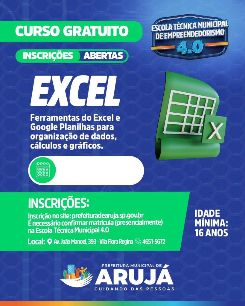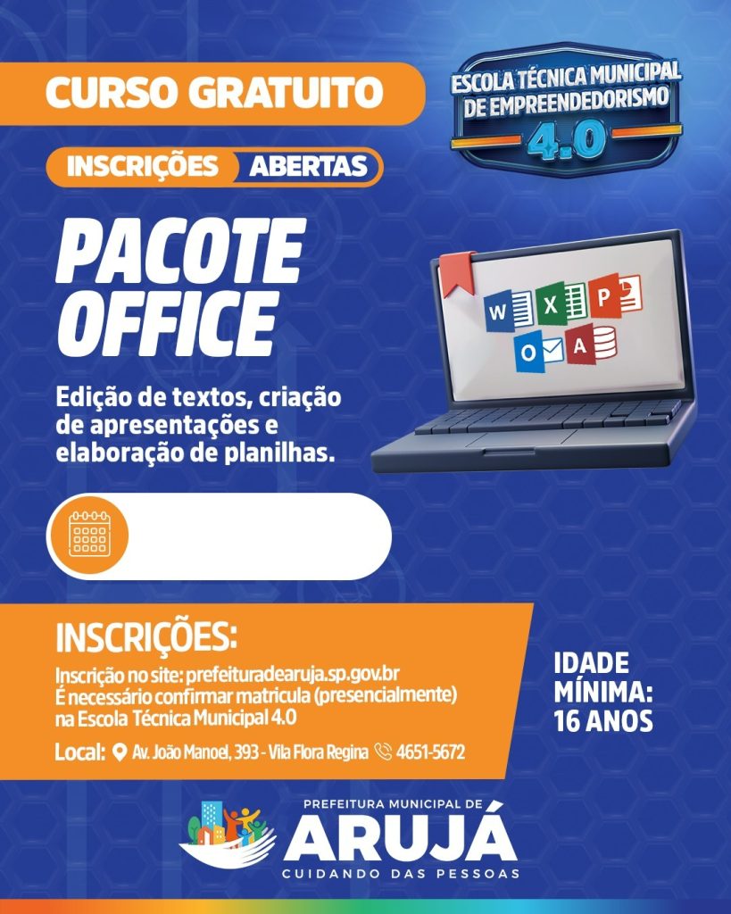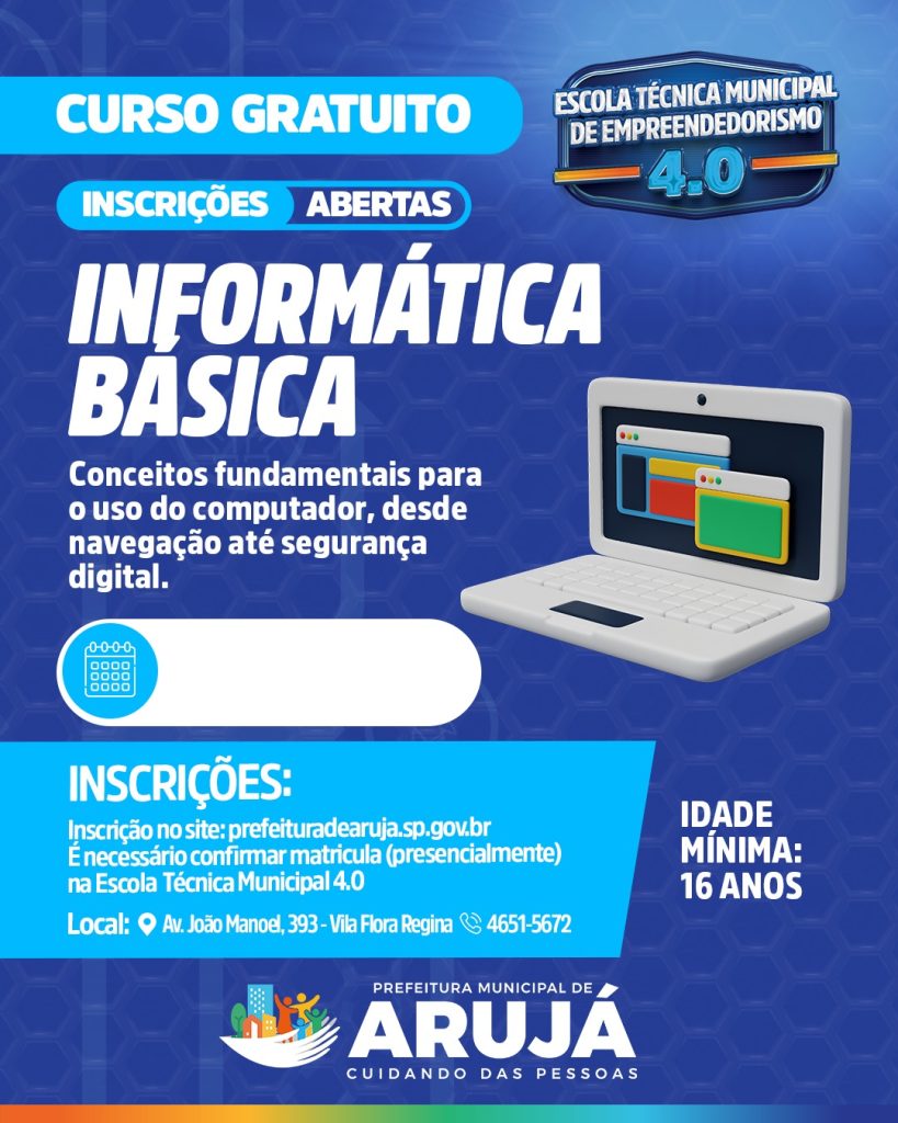 A Prefeitura de Arujá, por meio da Escola de Empreendedorismo e Tecnologia 4.0, está com inscrições abertas para novos cursos gratuitos na área de tecnologia. As oportunidades contemplam as modalidades de Informática Básica, Pacote Office e Excel Básico, com o objetivo de capacitar a população para o mercado de trabalho.