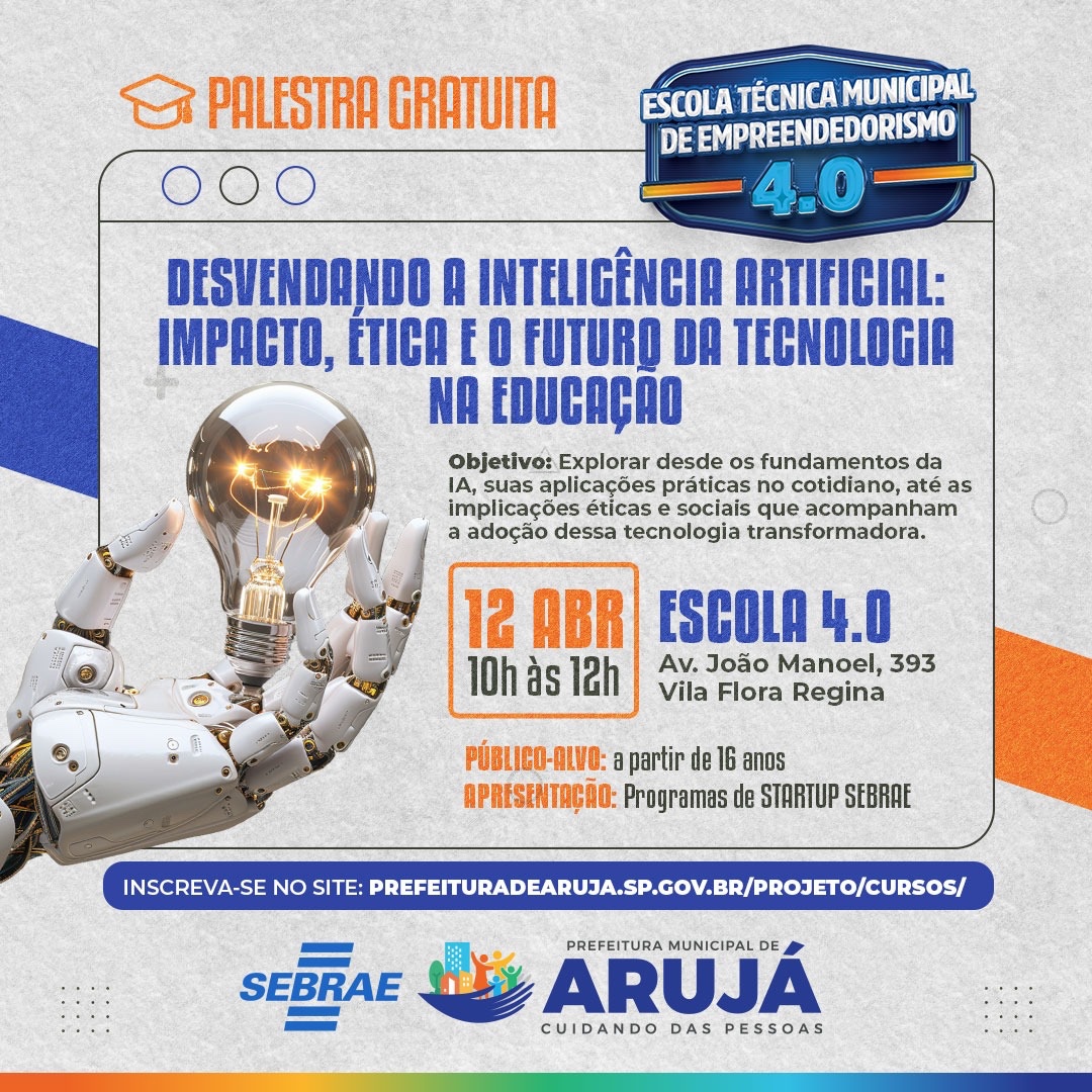 A Prefeitura de Arujá, em parceria com o Serviço Brasileiro de Apoio às Micro e Pequenas Empresas (Sebrae), promoverá nesta sexta-feira, dia 12, das 10h às 12h, na Escola Técnica Municipal de Empreendedorismo 4.0 (Avenida João Manoel, 393), a palestra gratuita intitulada “Desvendando a Inteligência Artificial: Impacto, Ética e o Futuro da Tecnologia na Educação”.