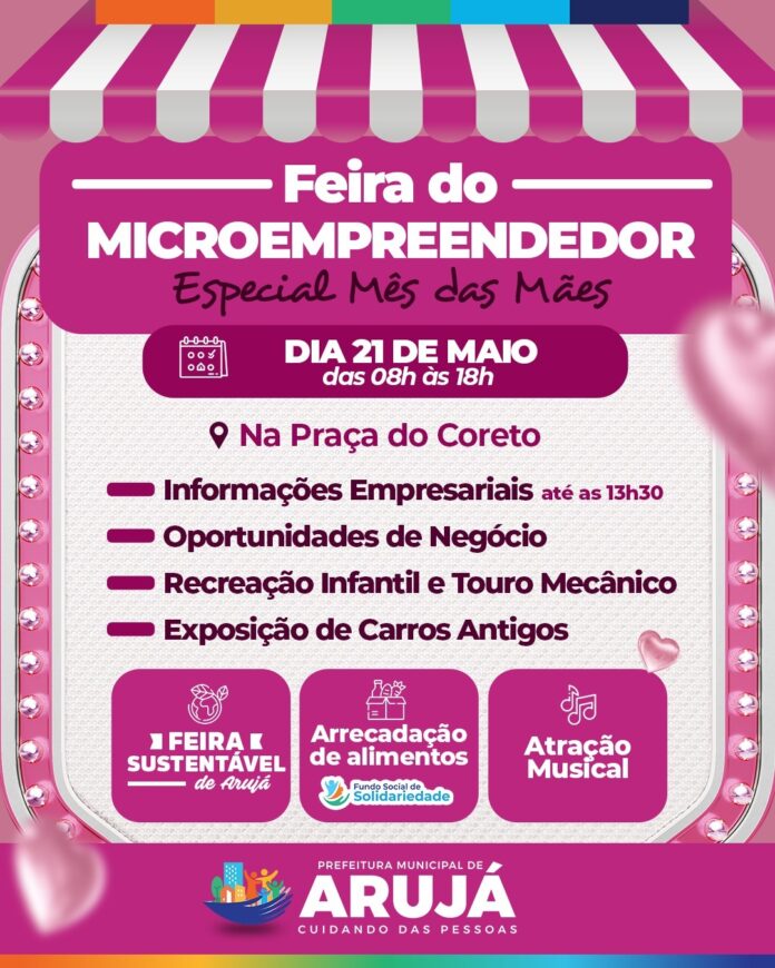 A Praça do Coreto recebe neste domingo (21) mais uma edição das Feiras do Microempreendedor e Sustentável, bem como o Encontro de Antiguidades. Neste Especial Mês das Mães, a ação das Secretarias Municipais de Desenvolvimento Econômico e Meio Ambiente ocorrerá das 8 às 15 horas e contará com diversas oportunidades de negócios e orientações, além de queijo, mudas, pastel, temperos, brechó, açaí, entre outros itens. Além disso, será possível apreciar os automóveis, motos, bicicletas e peças decorativas expostos no Encontro de Antiguidades.