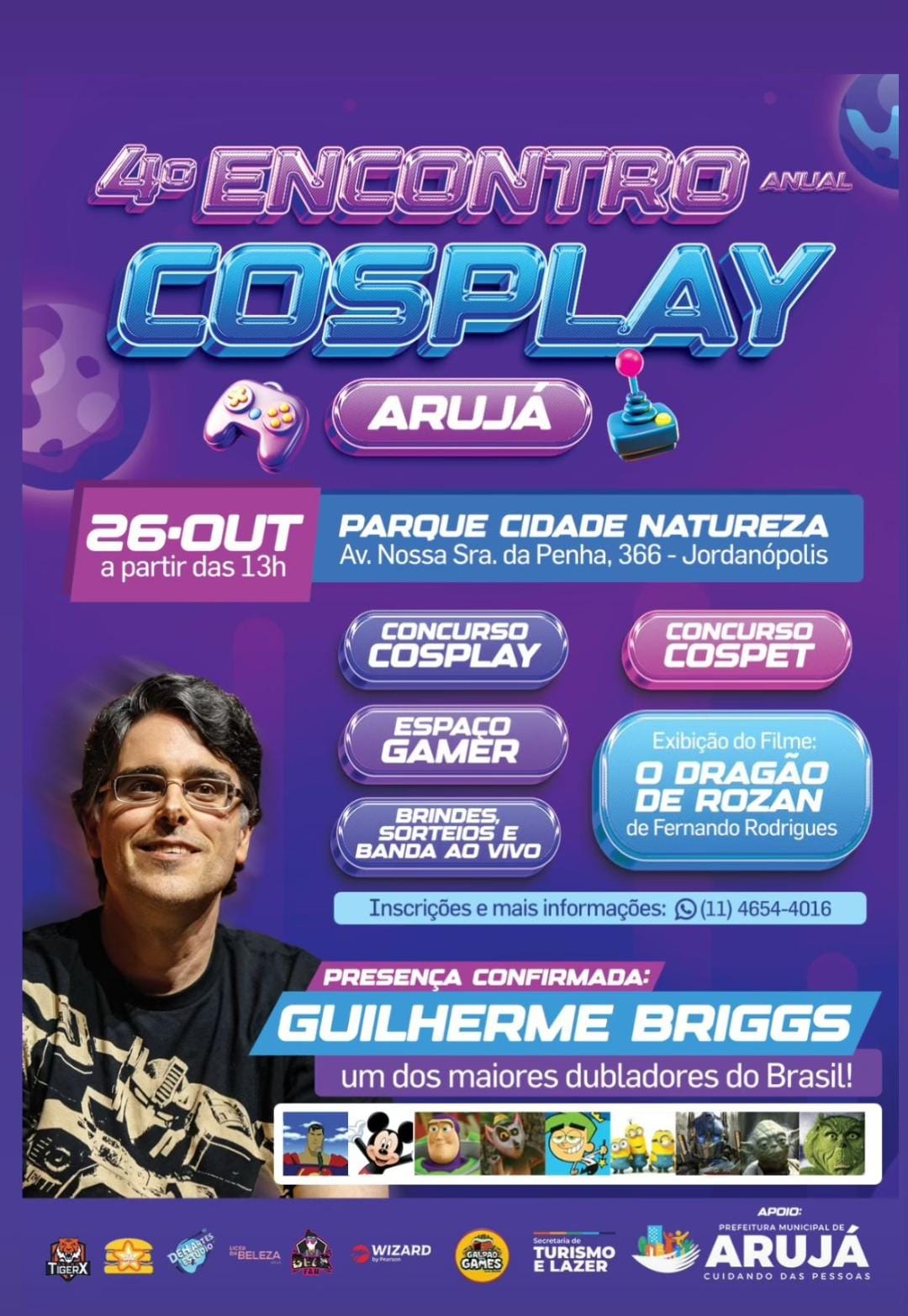 Dentre as atrações está Guilherme Briggs, um dos mais renomados dubladores brasileiros, que já deu voz a personagens como: Mickey Mouse, Buzz Lightyear (Toy Story), Cosmo (Os Padrinhos Mágicos), Rei Julien (Madagascar), Grinch (O Grinch), Bruce (Procurando Nemo) e Optimus Prime (Transformers). Além disso, haverá o Concurso de Cosplay, Concurso Cospet, Espaço Gamer, a exibição do filme O Dragão de Rozan, brindes e música ao vivo.