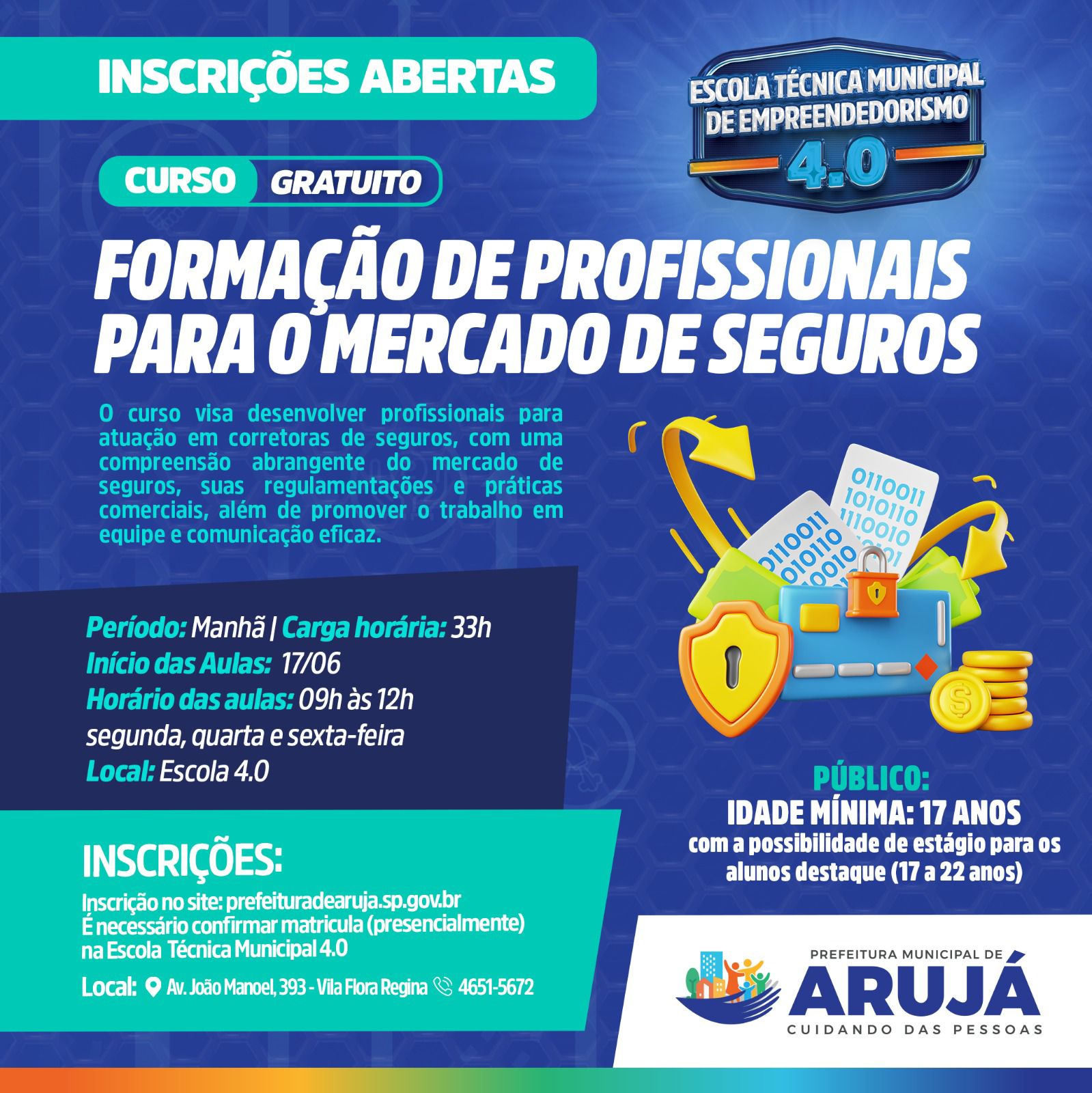 Estão abertas as inscrições para o curso gratuito de ‘Formação de Profissionais para o Mercado de Seguros’ na Escola Técnica Municipal 4.0, uma iniciativa da Prefeitura de Arujá, por meio da Secretaria Municipal de Desenvolvimento Econômico. As aulas acontecerão das 09h às 12h, às segundas, quartas e sextas-feiras, com início no dia 17 de junho e carga horária de 33 horas. Haverá possibilidade de estágio para os alunos de 17 a 22 anos que se destacarem.