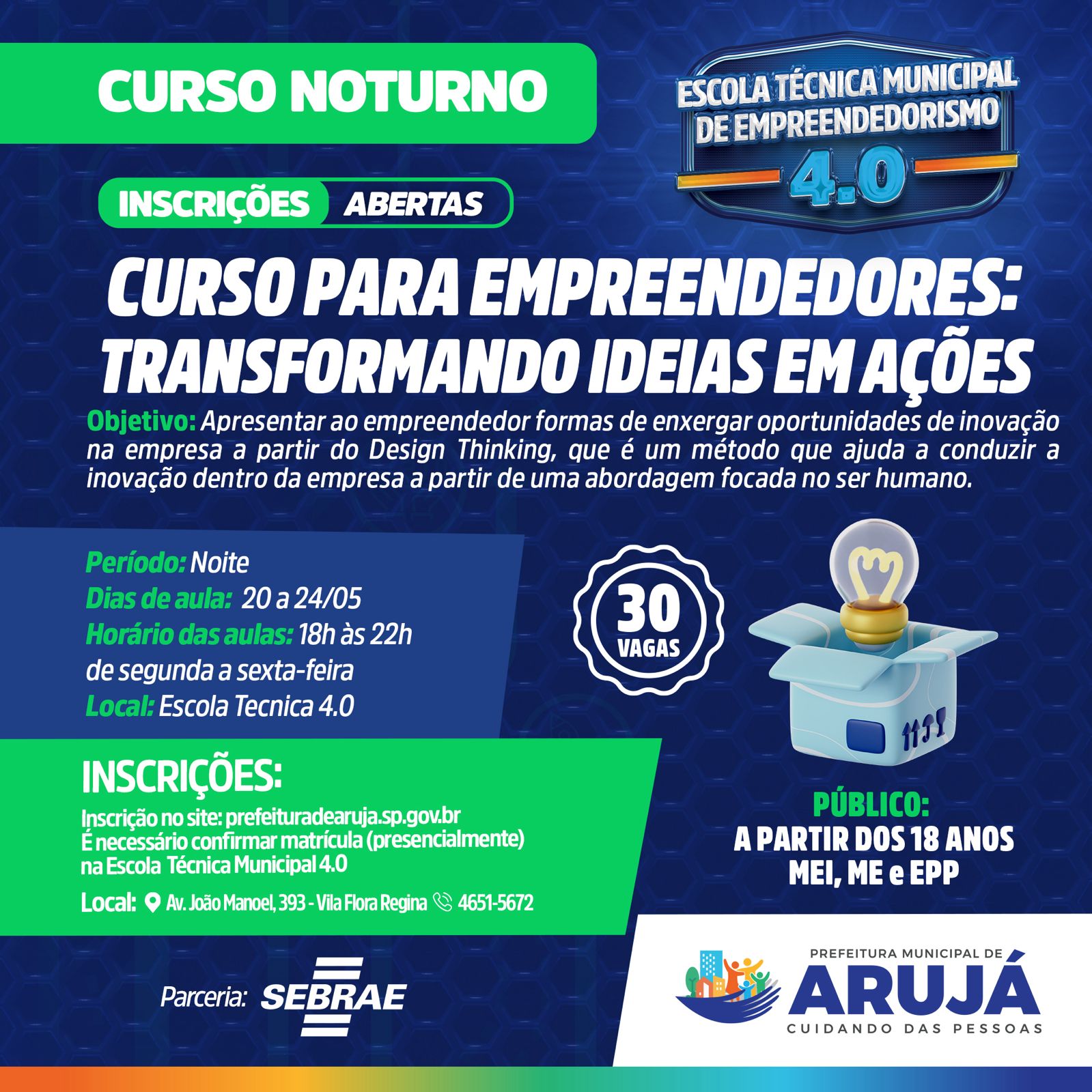 A Prefeitura de Arujá, por meio da Secretaria Municipal de Desenvolvimento Econômico, em parceria com o Sebrae, está iniciando as inscrições para o curso “Transformando Ideias em Ações”, que será realizado no período noturno.
