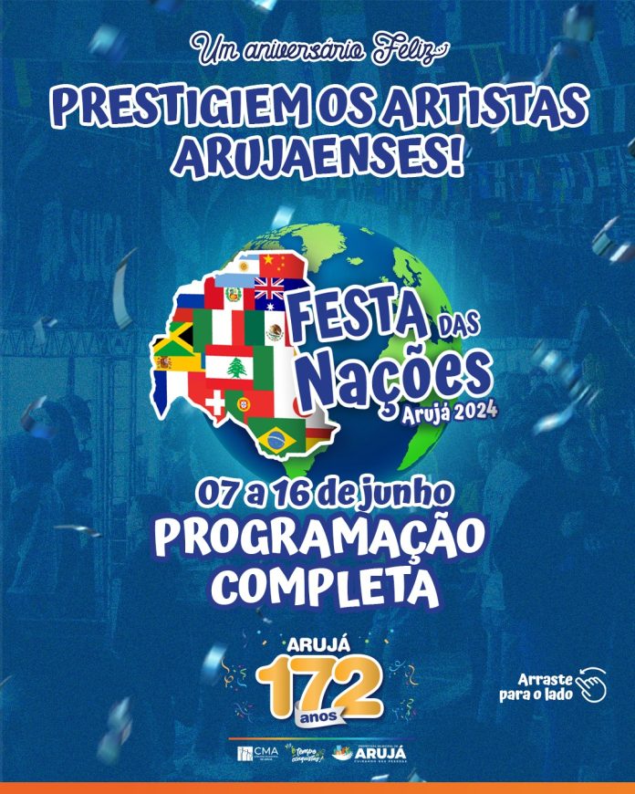 Está chegando mais uma edição da tradicional ‘Festa das Nações de Arujá’, que acontece anualmente na Praça do Coreto, celebrando o aniversário de 172 anos da cidade e a diversidade cultural que compõe sua população. No próximo final de semana, a Prefeitura, por meio da Secretaria Municipal de Cultura, inicia uma programação repleta de shows e apresentações, além de muitas comidas típicas de diversos países.