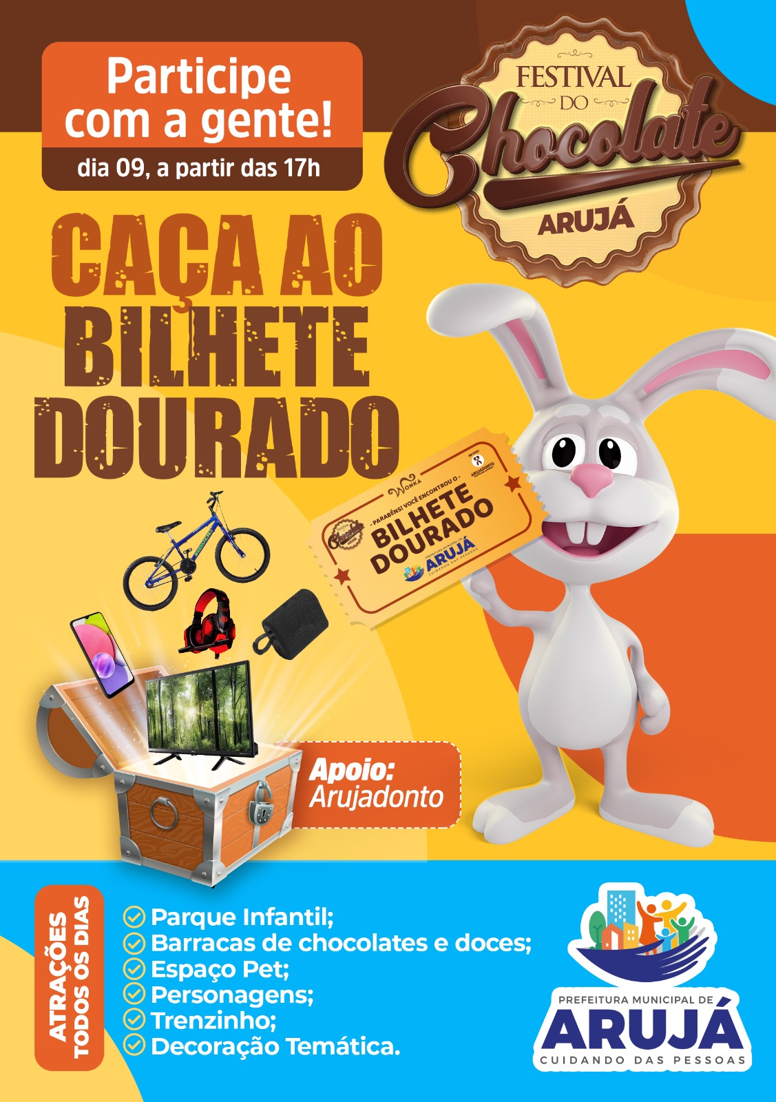 A Prefeitura de Arujá preparou uma programação especial para a Páscoa. Nos dias 07, 08 e 09 de abril acontecerá a segunda edição do Festival do Chocolate, com barracas de doces, música e muita diversão.