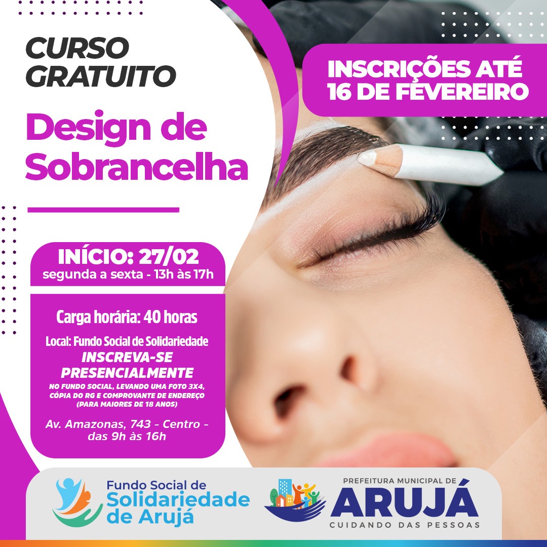 O Fundo Social de Solidariedade de Arujá está com inscrições abertas para cursos da área da estética, sendo eles: Design de sobrancelha e Depilação facial com linha. As matrículas devem ser realizadas na sede do Fundo Social, localizada na avenida Amazonas, 743, de segunda a sexta-feira, das 9 às 16 horas, e é necessário estar munido de documento com foto e comprovante de endereço.