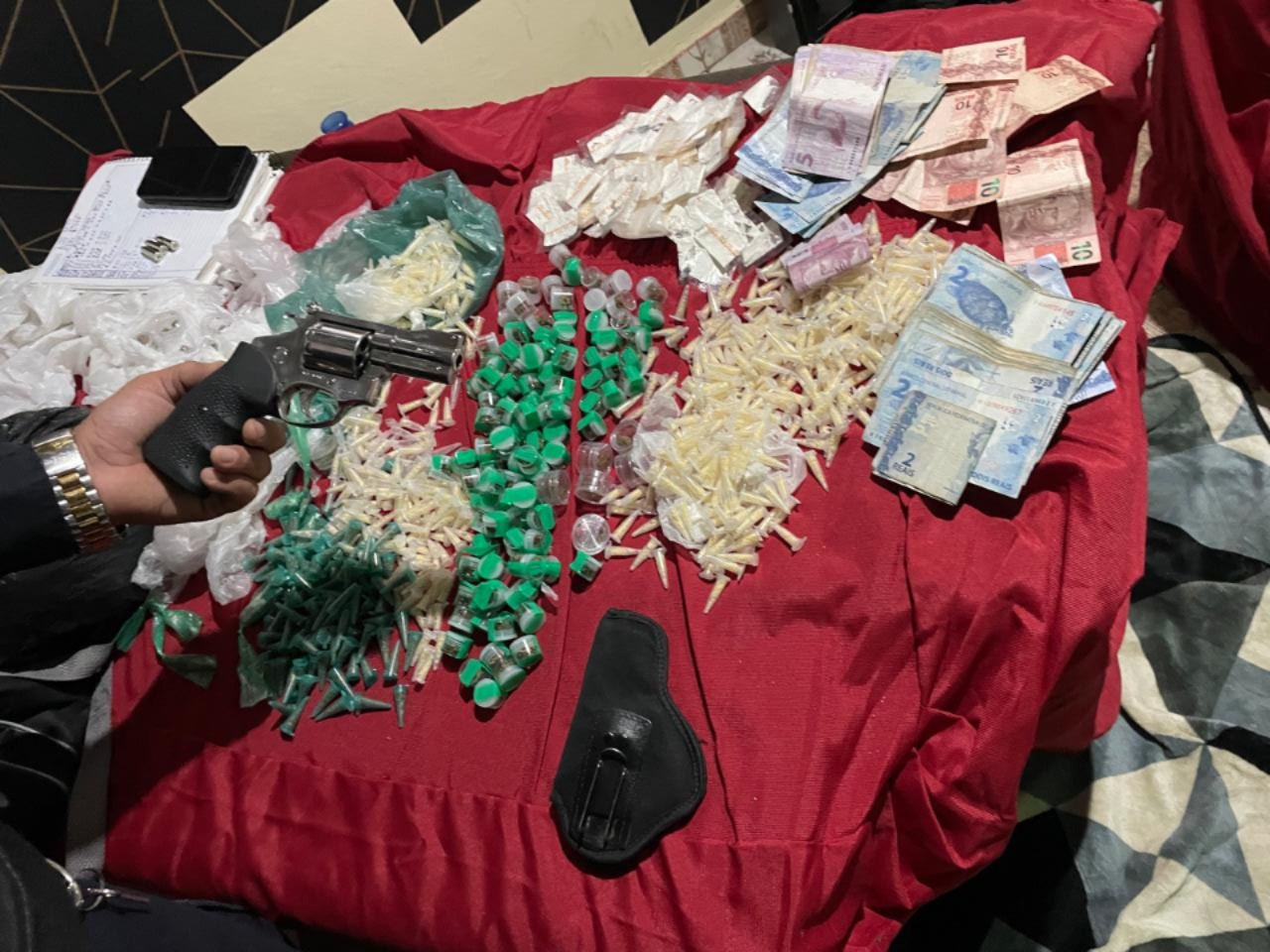 De acordo com o registro, o local funcionava como ponto de armazenamento e distribuição de drogas para a região. Foram localizadas 1.026 porções de maconha, 965 de cocaína e 1.108 pedras de crack, além de R$ 120 em dinheiro, dois cadernos com anotações do tráfico e dois celulares. Um revólver calibre .38 também foi encontrado no local.