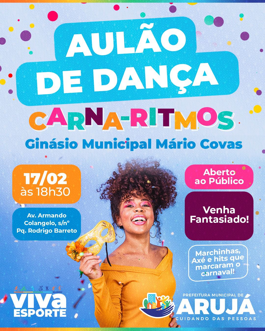 No próximo dia 17, a Prefeitura de Arujá, pela Secretaria Municipal de Esportes, realizará o “Carnaritmos”, um aulão de ritmos com tema de Carnaval, que contará com marchinhas, axé e hits que marcaram a folia. A ação ocorrerá no ginásio Mario Covas, localizado na avenida Dr. Armando Colângelo, 1584, Parque Rodrigo Barreto, a partir das 18h30. O público está convidado a ir a caráter, de fantasia.