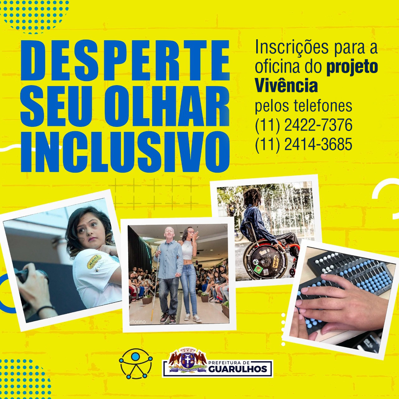 A Prefeitura de Guarulhos abriu inscrições para a oficina gratuita do projeto Vivência – Desperte Seu Olhar Inclusivo, que visa a informar e sensibilizar sobre práticas inclusivas de combate ao capacitismo e ao bullying. Ela é voltada a pessoas que trabalham no atendimento ao público e as vagas são limitadas. Interessados devem se inscrever pelos telefones (11) 2422-7376 ou 2414-3685.