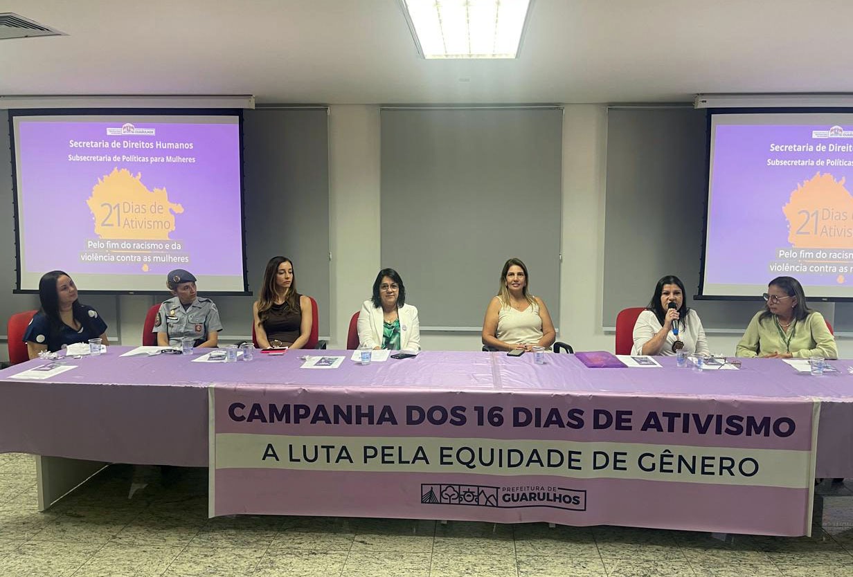 Mais de cem pessoas participaram nesta terça-feira (19) do lançamento oficial da campanha “16 + 5 Dias de Ativismo pelo Fim da Violência contra as Mulheres”, no auditório da Secretaria de Educação, Macedo. Com o tema “O Cenário Guarulhense e as Expectativas para o Futuro no Combate à Violência Contra a Mulher”, o evento contou com a participação do prefeito em exercício, Professor Jesus, e da subsecretária de Políticas para as Mulheres, Verinha Souza, entre outras autoridades.