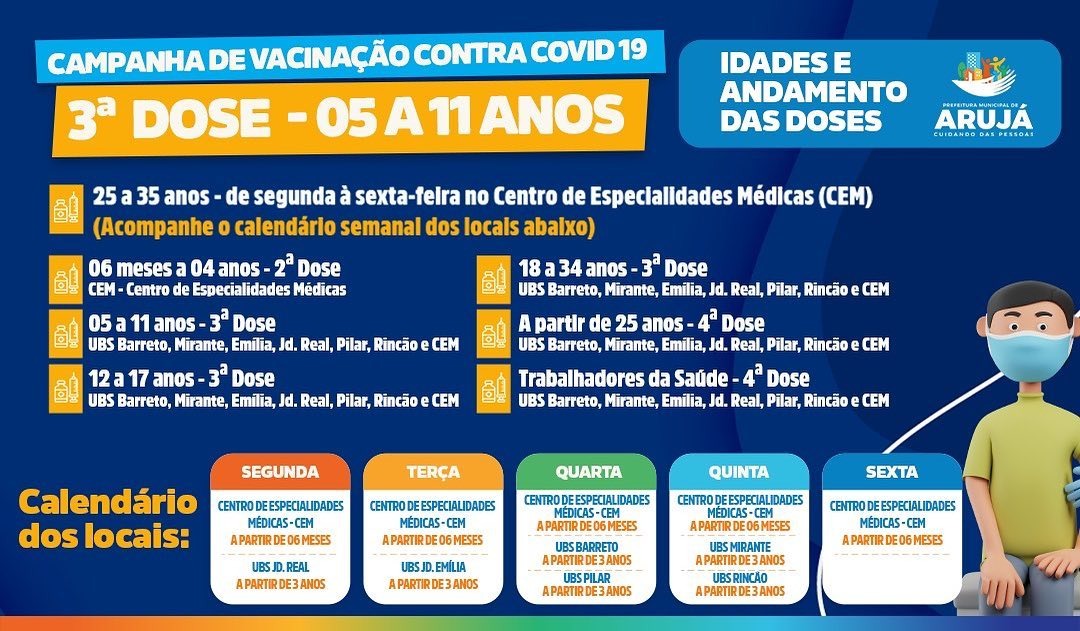 A vacinação de crianças de 5 a 11 anos de idade contra a Covid-19, com a 1ª dose de reforço, já foi iniciada. A aplicação ocorre de segunda a sexta-feira, das 8h às 16h, no Centro de Especialidades Médicas (CEM) e também segunda-feira na Unidade Básica de Saúde (UBS) Jardim Real; terça-feira na UBS Jardim Emília; quarta-feira na UBS Barreto e UBS Pilar; quinta-feira na UBS Mirante e Fazenda Rincão.