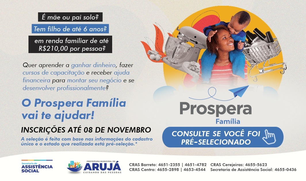 Estão abertas as inscrições para o programa estadual de capacitação e empreendedorismo, em parceria com a Prefeitura de Arujá, voltado a famílias monoparentais, o Prospera Família. Em Arujá, o programa prevê 240 vagas para famílias monoparentais (pais e mães que vivem sem cônjuge), que tenham pelo menos um filho ou dependente de 0 a 6 anos, além de possuir o cadastro atualizado junto ao Cadastro Único Federal e ter renda familiar de até R$ 210 por pessoa. As inscrições devem ser feitas até o dia 08 de novembro, através do site do Bolsa do Povo (https://www.bolsadopovo.sp.gov.br/).
