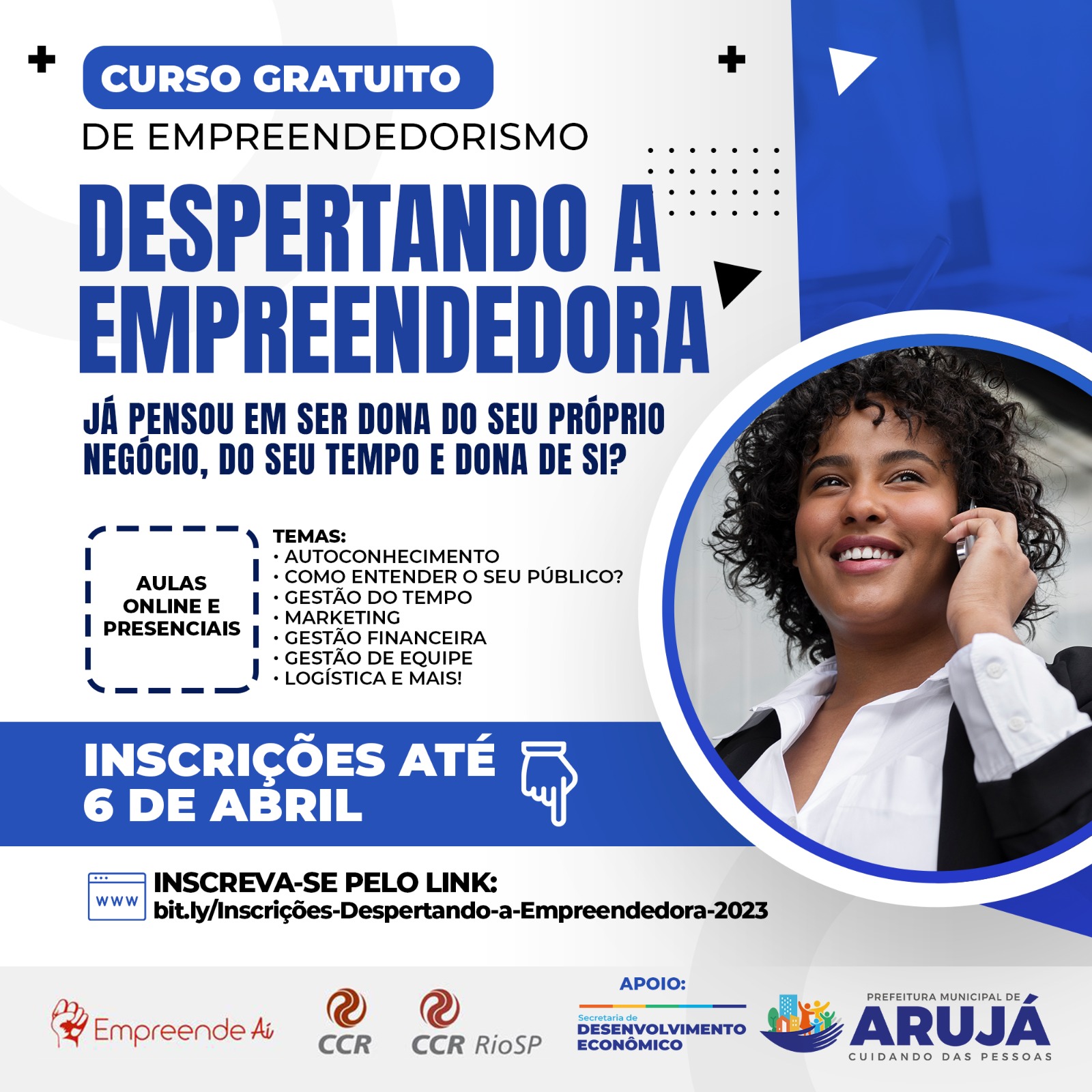 A Prefeitura de Arujá, pela Secretaria Municipal de Desenvolvimento Econômico, em parceria com a CCR RioSP e a plataforma Empreende Aí, disponibiliza o curso gratuito de empreendedorismo “Despertando a Empreendedora”. As inscrições devem ser realizadas até o dia 06 de abril pelo link: https://docs.google.com/forms/d/e/1FAIpQLSdAzMB9od9TQdO9HzM8hXejc25G7DSQzqlq_PUCW8W7XloPDQ/viewform. Serão abordados temas como: Marketing, Gestão Financeira, Gestão de Equipe, Logística, Como atender o público, dentre outros.