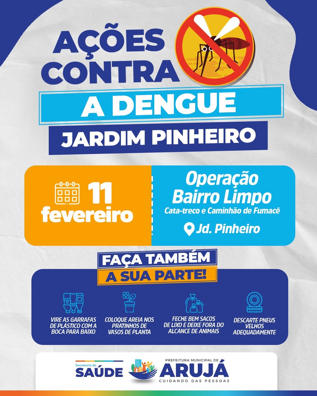 A Prefeitura de Arujá realiza, periodicamente, ações contra a dengue por toda a cidade e vem fazendo, junto à Secretaria Municipal de Saúde, pelo setor de Zoonoses, a “Operação Bairro Limpo”. A iniciativa levará ao Jardim Pinheiro neste sábado (11) o caminhão Cata-Treco, juntamente com o caminhão de fumacê, que percorrerão a localidade com agentes que recolherão objetos inservíveis que possam acumular água, o que gera a proliferação de larvas dos mosquitos transmissores da doença.