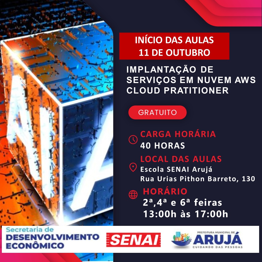 Começa no dia 11 de outubro, o curso gratuito de Implantação de Serviços em Nuvem – AWS Cloud Practitioner Foundational. A formação oferecida pela Prefeitura de Arujá, por meio da Secretaria Municipal de Desenvolvimento Econômico, em parceria com o Senai, visa o desenvolvimento de competências para implantação e gerenciamento de serviços em nuvem, permitindo que o profissional peça a certificação no sistema. Para participar, é preciso fazer a matrícula presencial na Escola Senai Arujá (R. Urias Pithon Barreto, 130, Chácara São José), levando cópias e original do CPF, RG, comprovante de endereço com CEP e Histórico Escolar ou uma declaração escolar original recente. Interessados devem ter idade mínima de 14 anos, Ensino Fundamental completo e conhecimentos básicos em redes de Comunicação. Atendimento de segunda a sexta, das 13h30 às 21 horas, e aos sábados, das 9 às 16 horas.
