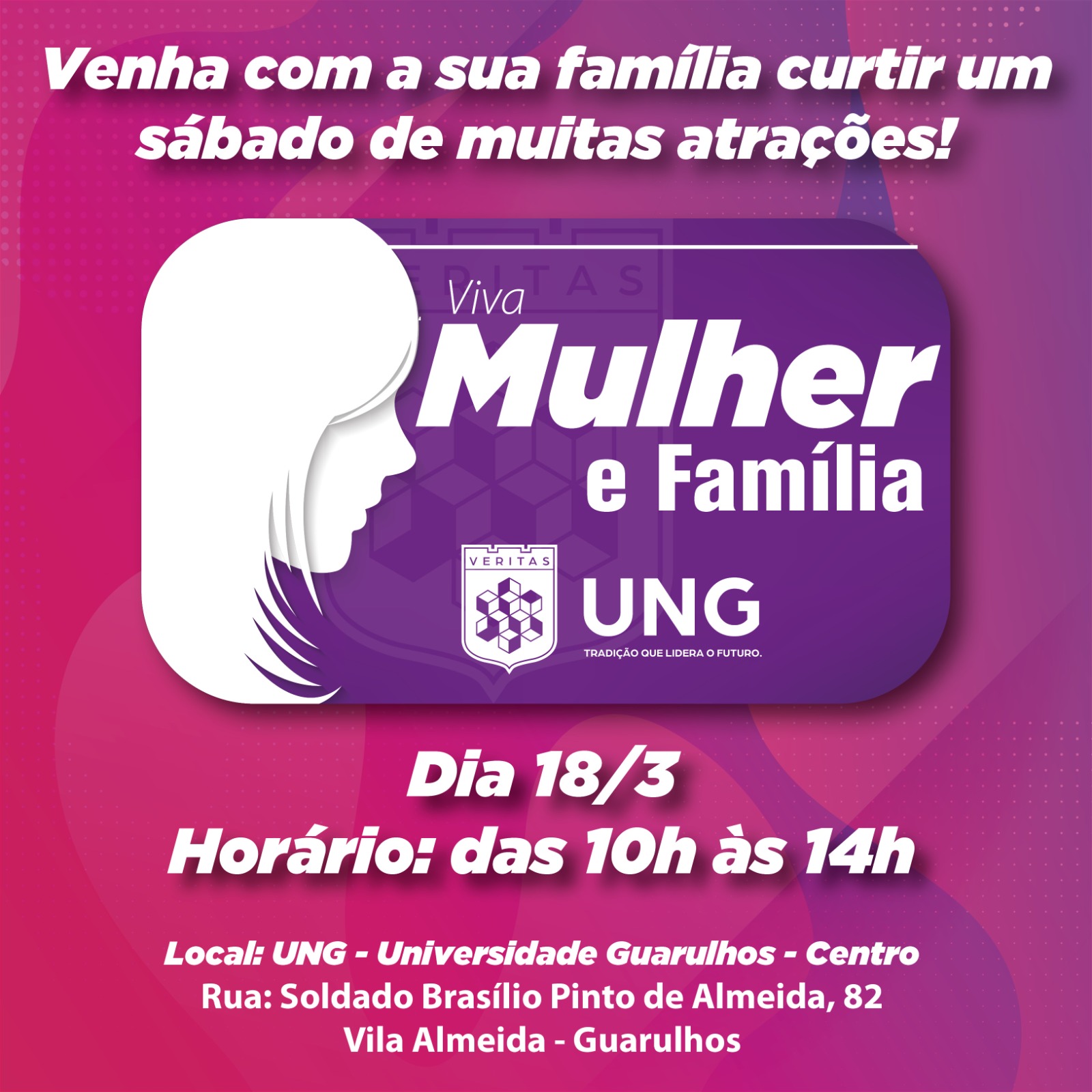 Em homenagem ao Mês da Mulher, a Universidade Guarulhos (UNG) preparou uma série de atrações gratuitas para o evento “Viva Mulher e Família” com atividades culturais, de esporte, lazer e serviços de estágio e emprego. A programação acontecerá no dia 18 de março, das 10h às 14h, no campus Centro.