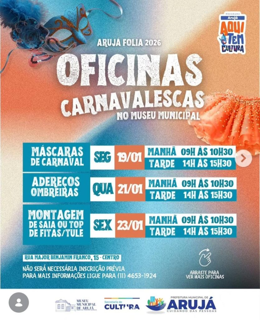 A Secretaria Municipal de Cultura de Arujá iniciará na próxima semana uma série de oficinas gratuitas voltadas à confecção de adereços carnavalescos. As atividades fazem parte do programa Arujá Folia 2026 e serão realizadas na sede do Museu Municipal.