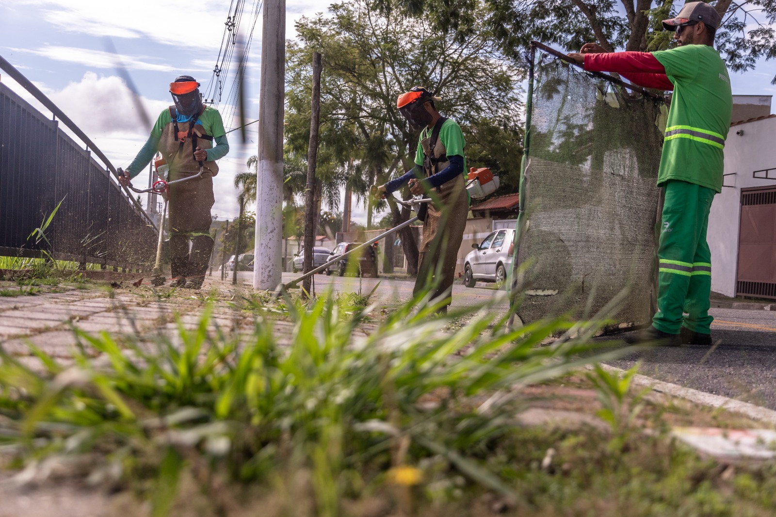 Equipes da Secretaria Municipal de Obras, Meio Ambiente, Planejamento e Serviços Públicos percorrem ruas promovendo serviços como corte de vegetação e poda de árvores